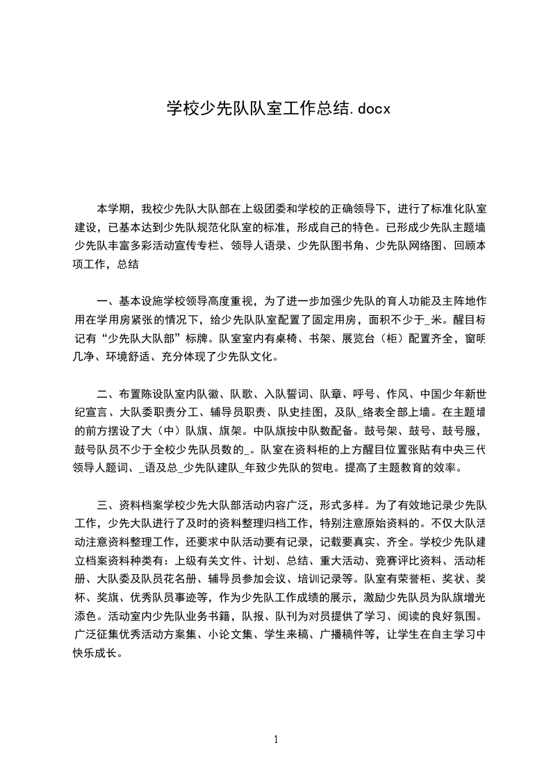 一、基本设施学校领导高度重视,为了进一步加强少先队的育人功能及主阵地作用在学用房紧张的情况下,给少先队队室配置了固定用房,面积不少于_米。醒目标记有“少先队大队部”标牌。队室室内有桌椅、书架、展览台(柜)配置齐全,窗明几净、环境舒适、充分体现了少先队文化。