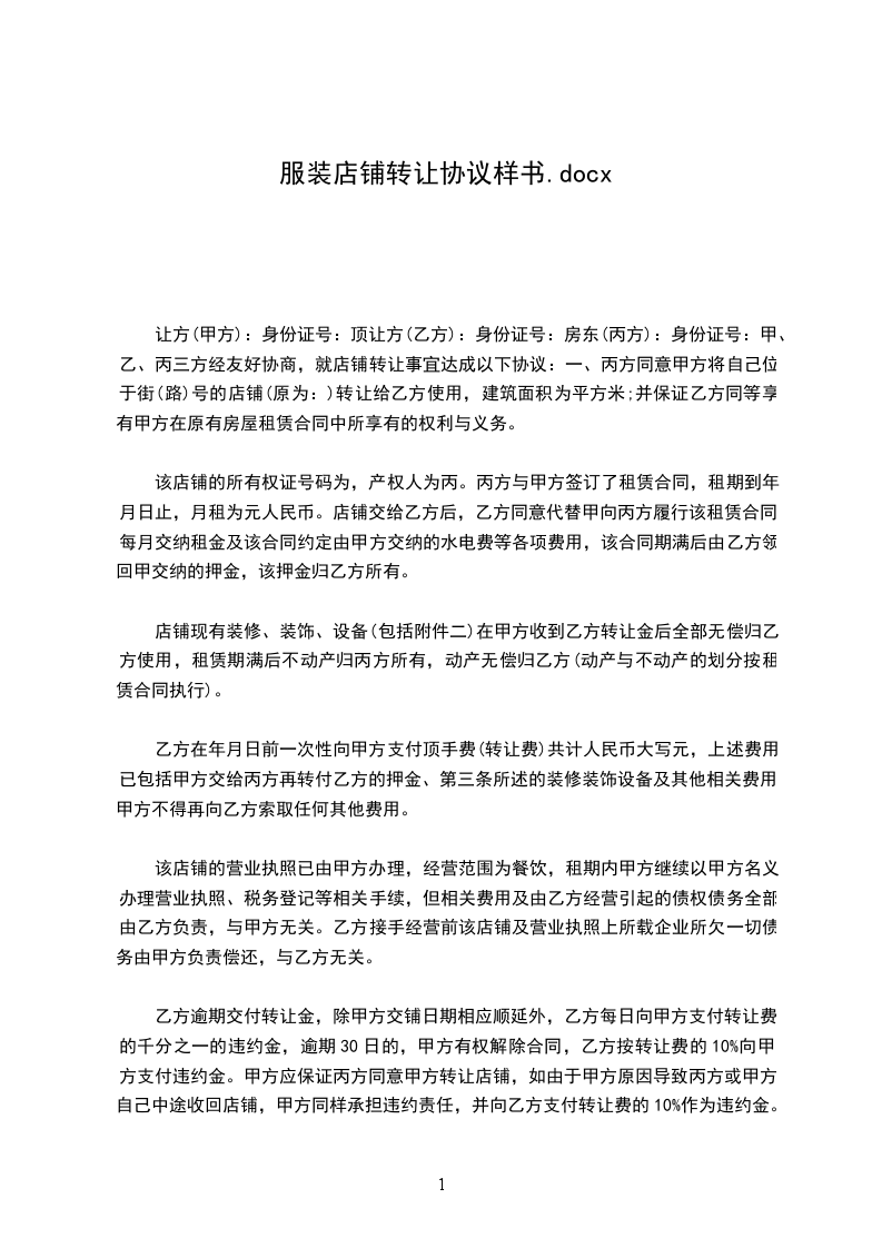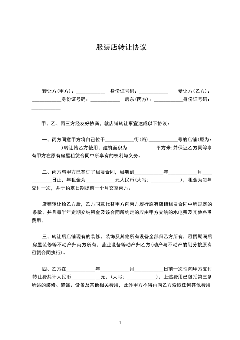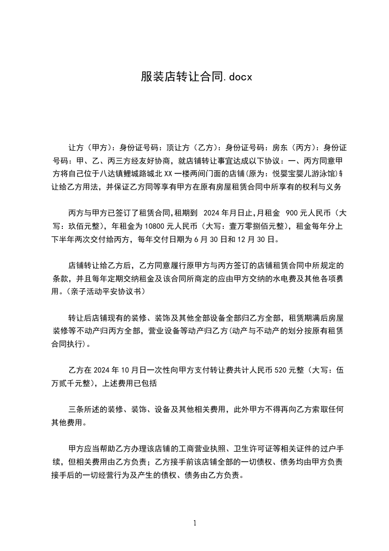 让方(甲方):身份证号码:顶让方(乙方):身份证号码:房东(丙方):身份证号码:甲、乙、丙三方经友好协商,就店铺转让事宜达成以下协议:一、丙方同意甲方将自己位于八达镇鲤城路城北XX一楼两间门面的店铺(原为:悦婴宝婴儿游泳馆)转让给乙方用法,并保证乙方同等享有甲方在原有房屋租赁合同中所享有的权利与义务。