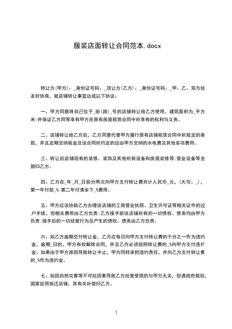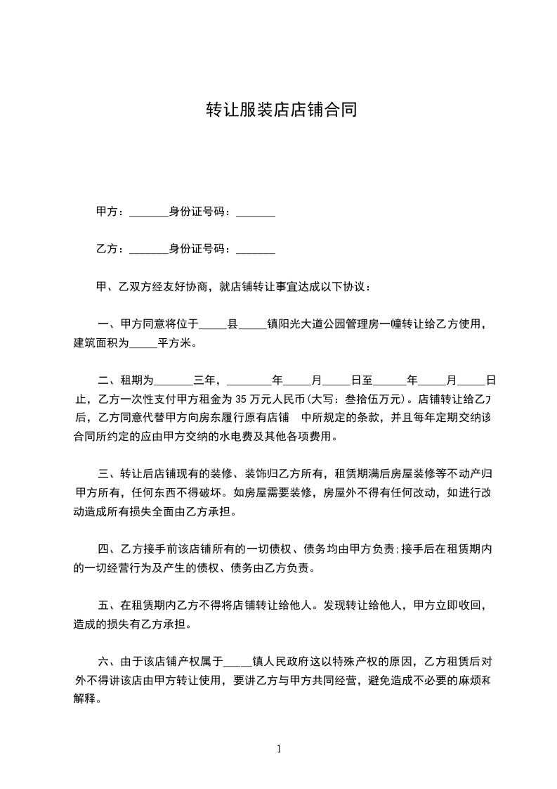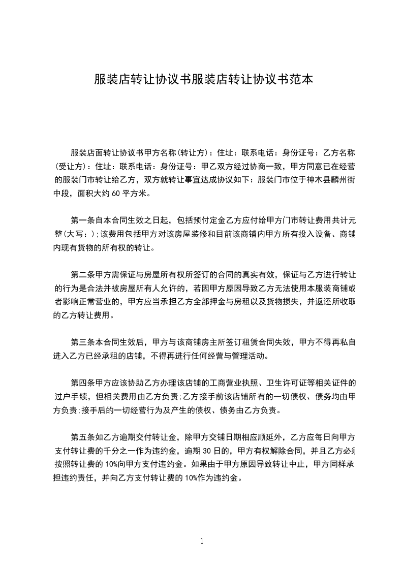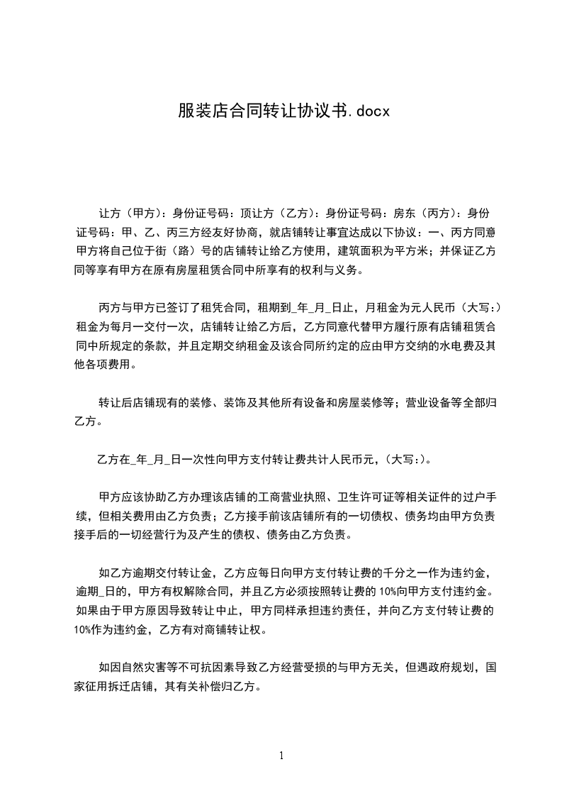让方(甲方):身份证号码:顶让方(乙方):身份证号码:房东(丙方):身份证号码:甲、乙、丙三方经友好协商,就店铺转让事宜达成以下协议:一、丙方同意甲方将自己位于八达镇鲤城路城北XX一楼两间门面的店铺(原为:悦婴宝婴儿游泳馆)转让给乙方用法,并保证乙方同等享有甲方在原有房屋租赁合同中所享有的权利与义务。