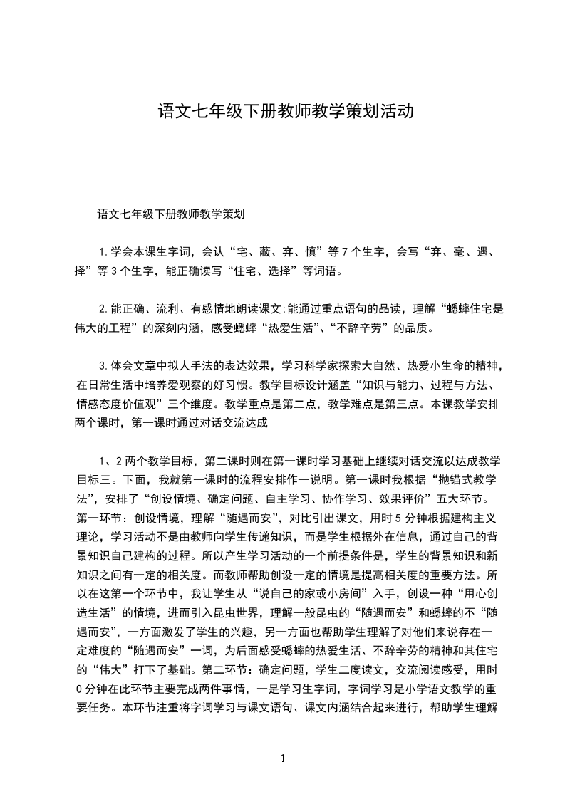 1、2两个教学目标,第二课时则在第一课时学习基础上继续对话交流以达成教学目标三。下面,我就第一课时的流程安排作一说明。第一课时我根据“抛锚式教学法”,安排了“创设情境、确定问题、自主学习、协作学习、效果评价”五大环节。第一环节:创设情境,理解“随遇而安”,对比引出课文,用时5分钟根据建构主义理论,学习活动不是由教师向学生传递知识,而是学生根据外在信息,通过自己的背景知识自己建构的过程。所以产生学习活动的一个前提条件是,学生的背景知识和新知识之间有一定的相关度。而教师帮助创设一定的情境是提高相关度的重要方法。所以在这第一个环节中,我让学生从“说自己的家或小房间”入手,创设一种“用心创造生活”的情境,进而引入昆虫世界,理解一般昆虫的“随遇而安”和蟋蟀的不“随遇而安”,一方面激发了学生的兴趣,另一方面也帮助学生理解了对他们来说存在一定难度的“随遇而安”一词,为后面感受蟋蟀的热爱生活、不辞辛劳的精神和其住宅的“伟大”打下了基础。第二环节:确定问题,学生二度读文,交流阅读感受,用时0分钟在此环节主要完成两件事情,一是学习生字词,字词学习是小学语文教学的重要任务。本环节注重将字词学习与课文语句、课文内涵结合起来进行,帮助学生理解蟋蟀住宅的特点,初步感受其住宅的“伟大”,这就充分体现了新课标下对语文的“工具性”和“人文性”的共同关注,真正实现两者的统一,使学生取得扎实的学习成效。第二件事是确定一个大家共同学习的问题,我认为,语文教学一定要尊重作者的写作意图和学生的阅读体验,所以用“作者最想告诉大家的是什么”和“你获得的最深感受是什么”两个问题来启发,并最终确定本节课的研究问题:“为什么说蟋蟀的住宅是伟大的工程”。虽然阅读是个性化的行为,但是正如建构主义所认为的:世界是客观存在的,对每个认识世界的个体来说是共通的,这就为确定相同的研究问题提供了理论基础和现实可能。第三环节:自主学习,学生默读课文,深入体会“伟大”,用时5分钟默读的好处是能够促进人的自主思考,使阅读实现个性化,同时实现新信息与学生背景知识的联系和建立。在这一环节,我让学生带着确定的问题与文本进行独立对话,采用在相应语句旁作标记和批注的方式,培养学生良好的阅读习惯。从第二大环节的“概括”性阅读到本环节的“具体化”研读,符合阅读规律,提高了学生的阅读能力。同时,我提醒学生在默读中,关注课文中的“鱼泡泡”、插图、生字、思考题、资料袋等材料,帮助学生树立正确的阅读的概念。第四环节:协作学习,反馈交流感受,提升“伟大”原因,用时5分钟这一环节是课堂之所以为课堂,区别于完全独立阅读的特点。建构主义认为,自主的阅读促使了学生情感的变化,而在课堂学习活动中,学生通过与其他学生和教师的不断交流与沟通,就能更好地实现意义建构和情感变化。所以此环节,我组织学生根据自己的感受,找出文中相关的语句(或图片)等各种材料佐证说明自己的观点。在此过程中,教师是学习伙伴、学生学习的组织者、引导者、激励者,因此构建了绿色和谐的课堂。教师的作用更多地体现为在学生需要帮助的时候给予帮助、学生未能提升的时候给予提升、学生朗读不到位的时候给予指导。因此,本环节中,学生和教师通过对“它常常慎重地选择住址,一定要排水优良,并且有温和的阳光”、“它的舒服的住宅是自己一点一点挖掘的,从大厅一直到卧室”等具体语句的品析,感受蟋蟀住宅的科学、精致、舒服和浩大壮观,感受蟋蟀在建筑住宅时表现出的智慧和不辞辛苦。对于学生疑惑的“这么一个最多不过九寸深、一指宽的洞穴怎么谈得上伟大”这一问题,则采用对照方式,以相当于一个人在没有任何工具的帮助下挖掘300米的隧道帮助学生感受,并抓住“工具的柔弱与简单”和“工程的浩大与壮观”的极大反差,很好地帮助学生进行真切的感受。同时,在品析之后及时进行朗读指导,较好地培养了学生的语感。语文七年级下册教师教学策划2教学目标: