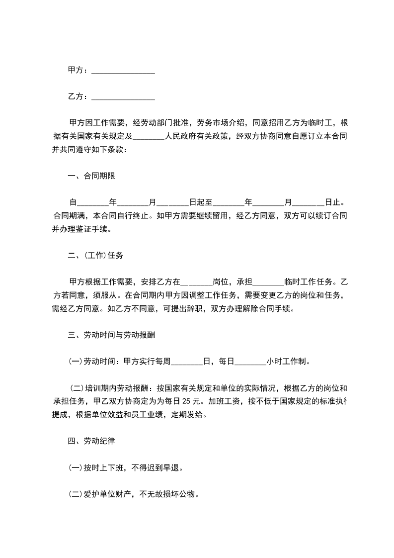 甲方因工作需要,经劳动部门批准,劳务市场介绍,同意招用乙方为临时工,根据有关国家有关规定及________人民政府有关政策,经双方协商同意自愿订立本合同,并共同遵守如下条款: