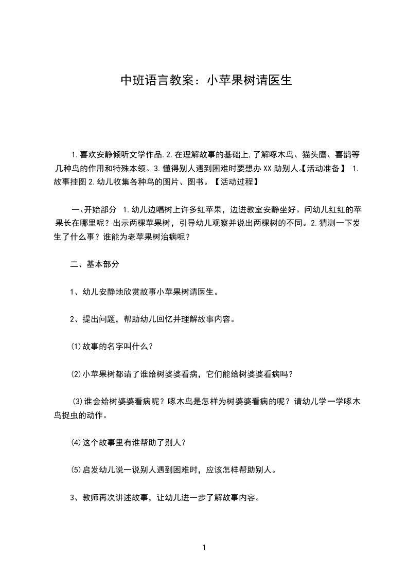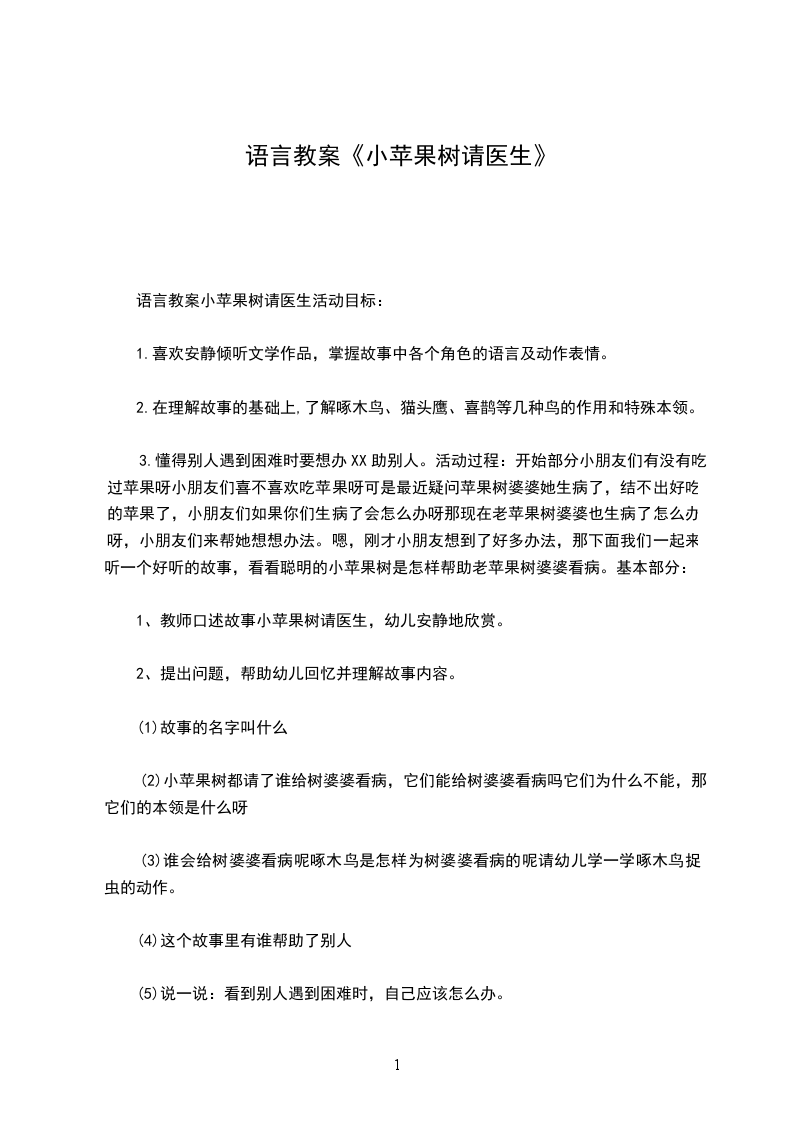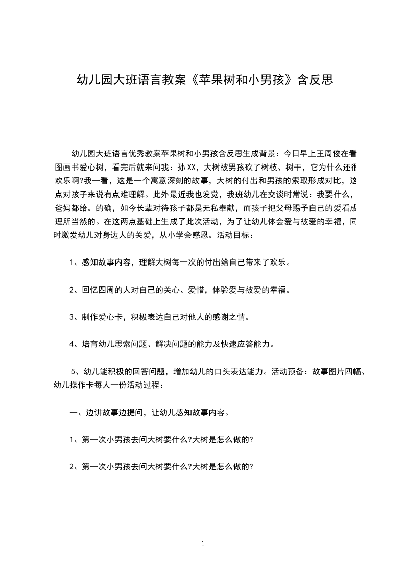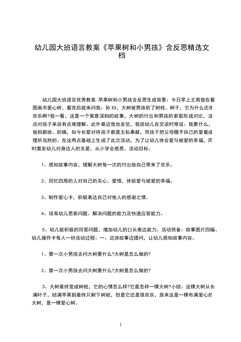 幼儿园大班语言优秀教案苹果树和小男孩含反思生成背景:今日早上王周俊在看图画书爱心树,看完后就来问我:孙XX,大树被男孩砍了树枝、树干,它为什么还很欢乐啊?我一看,这是一个寓意深刻的故事,大树的付出和男孩的索取形成对比,这点对孩子来说有点难理解。此外最近我也发觉,我班幼儿在交谈时常说:我要什么,爸妈都给。的确,如今长辈对待孩子都是无私奉献,而孩子把父母赐予自己的爱看成理所当然的。在这两点基础上生成了此次活动,为了让幼儿体会爱与被爱的幸福,同时激发幼儿对身边人的关爱,从小学会感恩。活动目标: