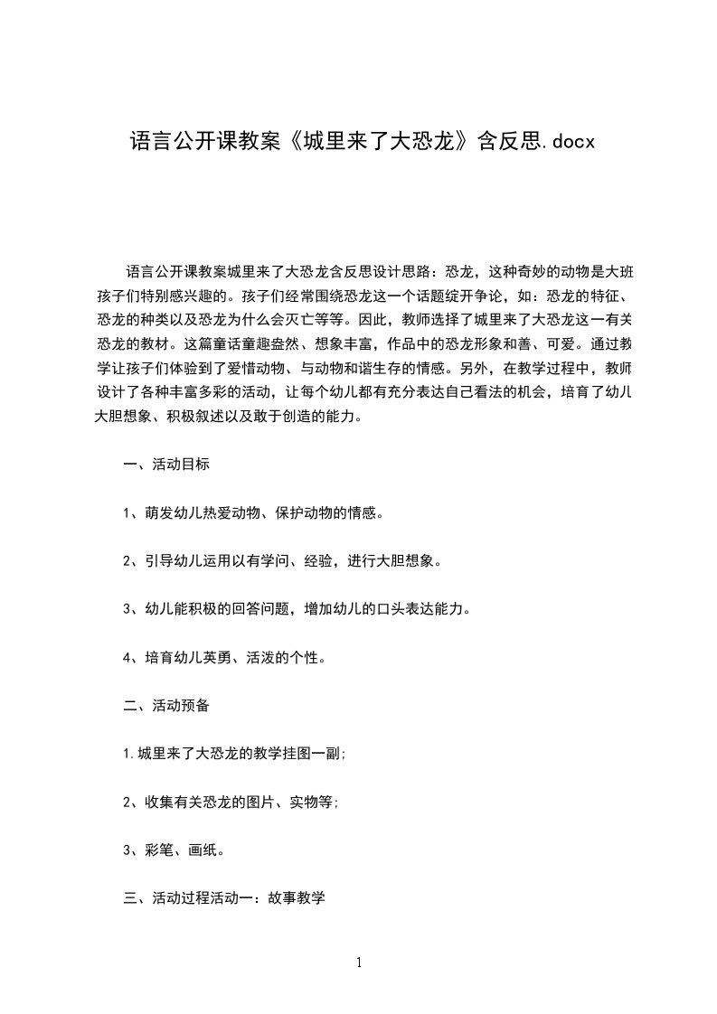 (一)出示恐龙,引出课题师:这几天小朋友带来了恐龙,老师知道你们喜欢恐龙,今天老师带来了有关恐龙的故事。有一天恐龙来到了城里,你们想会发生什么事呢?(幼儿自由发言)