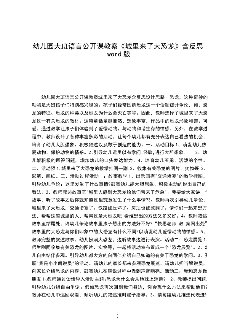七、教学反思为了上好这堂课,我预先在网上搜索了许多恐龙的图片,利用空余时间给小朋友欣赏了恐龙的图片,这下幼儿的兴致就来了,特别是有些幼儿还自己找来有关介绍恐龙的画书来看,孩子们兴奋的讲述着自己对恐龙的了解和认识,有些甚至让我都觉得自叹不如。幼儿心中的恐龙世界真是太奇妙了。上课的时候,我提问:如果恐龙来到城市里会怎么样呢?孩子们尽情发挥想象,有的说:“恐龙会把我们的房子都撞倒。”有的说:“恐龙会把汽车踩扁。”看来孩子们对这种形体上的大小概念还是非常清晰的,能够发挥自己的想象,充分夸大恐龙来到城市之后发生的事情。然后我再让幼儿欣赏故事城里来了大恐龙,幼儿对故事内容就理解得更透彻了。通过这个故事的教学,幼儿知道了恐龙最后为城市里做了很大贡献,更加增进了他们对恐龙的喜爱之情,并且也萌发了帮助别人的美好愿望。