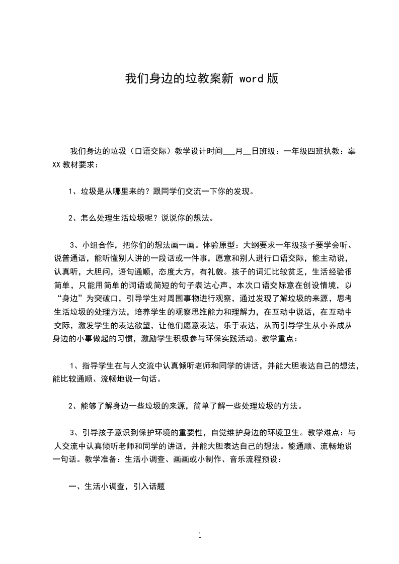 我们身边的垃圾(口语交际)教学设计时间___月__日班级:一年级四班执教:辜XX教材要求: