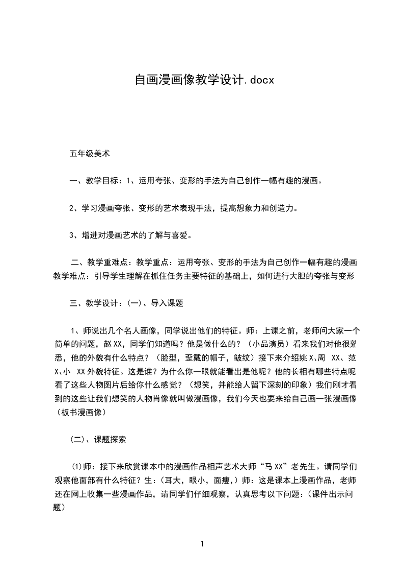 1、师说出几个名人画像,同学说出他们的特征。师:上课之前,老师问大家一个简单的问题,赵XX,同学们知道吗?他是做什么的?(小品演员)看来我们对他很熟悉,他的外貌有什么特点?(脸型,歪戴的帽子,皱纹)接下来介绍姚X、周XX、范X、小XX外貌特征。这是谁?为什么你一眼就能看出是他呢?他的长相有哪些特点呢?看了这些人物图片后给你什么感觉?(想笑,并能给人留下深刻的印象)我们刚才看到的这些让我们想笑的人物肖像就叫做漫画像,我们今天也要来给自己画一张漫画像(板书漫画像)
