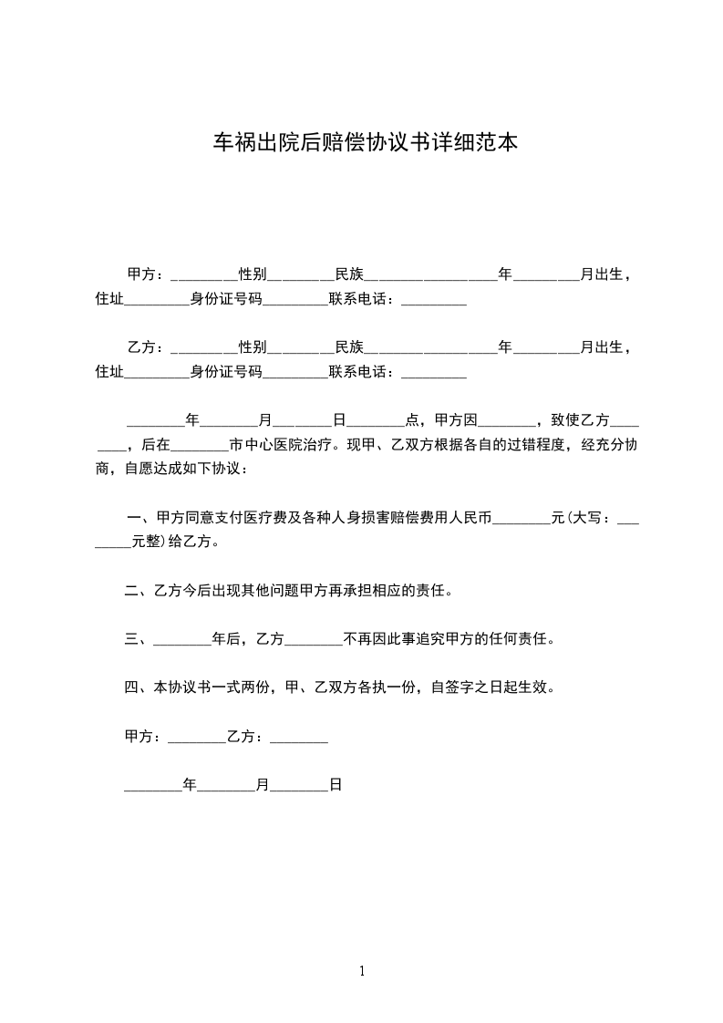 车祸出院后赔偿协议书详细范本