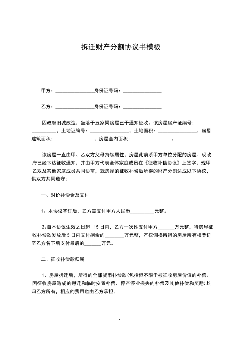 该房屋一直由甲、乙双方父母持续居住,房屋此前系甲方单位分配的房屋,现政府已经下达征收通知,并由甲方代表全体家庭成员在《征收补偿协议》上签字,现甲、乙双及其他家庭成员共同协商,就房屋的征收补偿后所得的财产分割达成以下协议,供双方共同遵守:________________