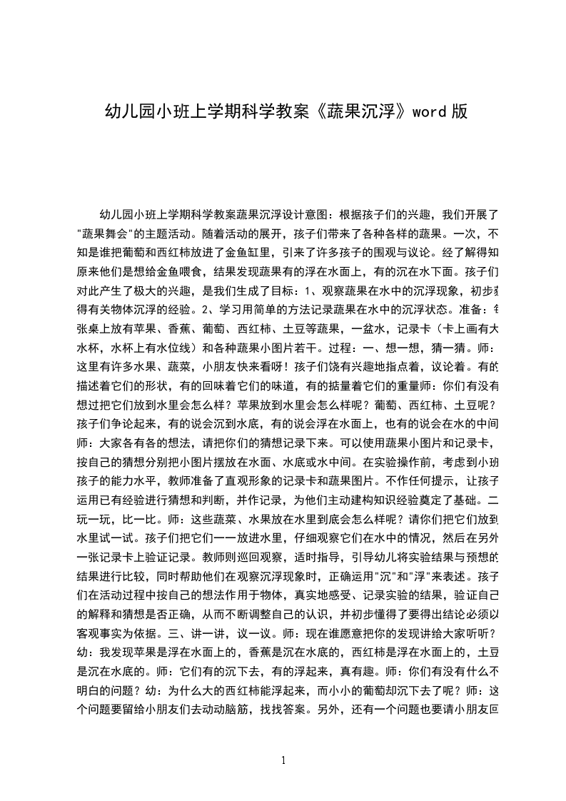 2、思考与讨论“沉浮兄弟吃错了水果,就要拉肚子,所以我们要帮兄弟俩把水果分出来。”“小朋友,你们想一想,这些水果放在水里,哪些会浮起来,哪些会沉下去呢?”幼儿自由讨论后回答“刚才小朋友们各有各的说法,我们也不知道到底哪些水果放在水里是沉下去的,哪些水果是浮起来的。现在就请小朋友每人拿一样水果,放到水里去试一试,看看你拿的水果在水里到底是沉是浮。