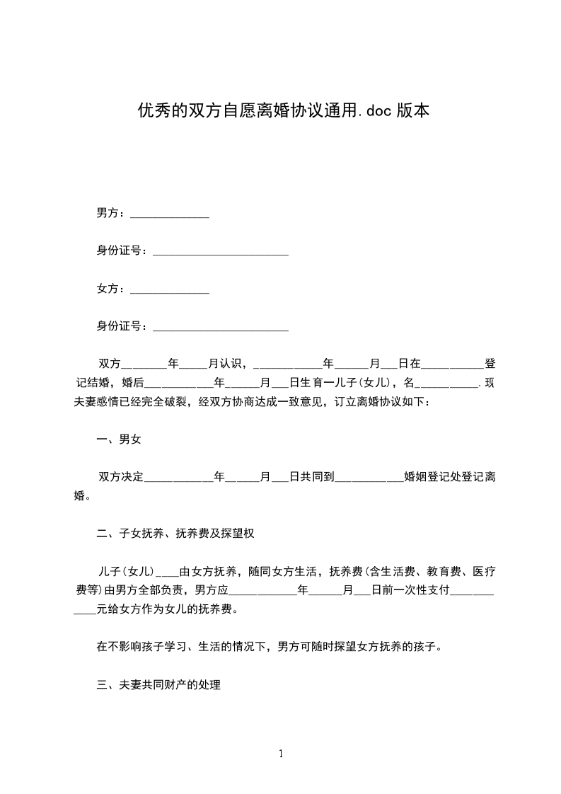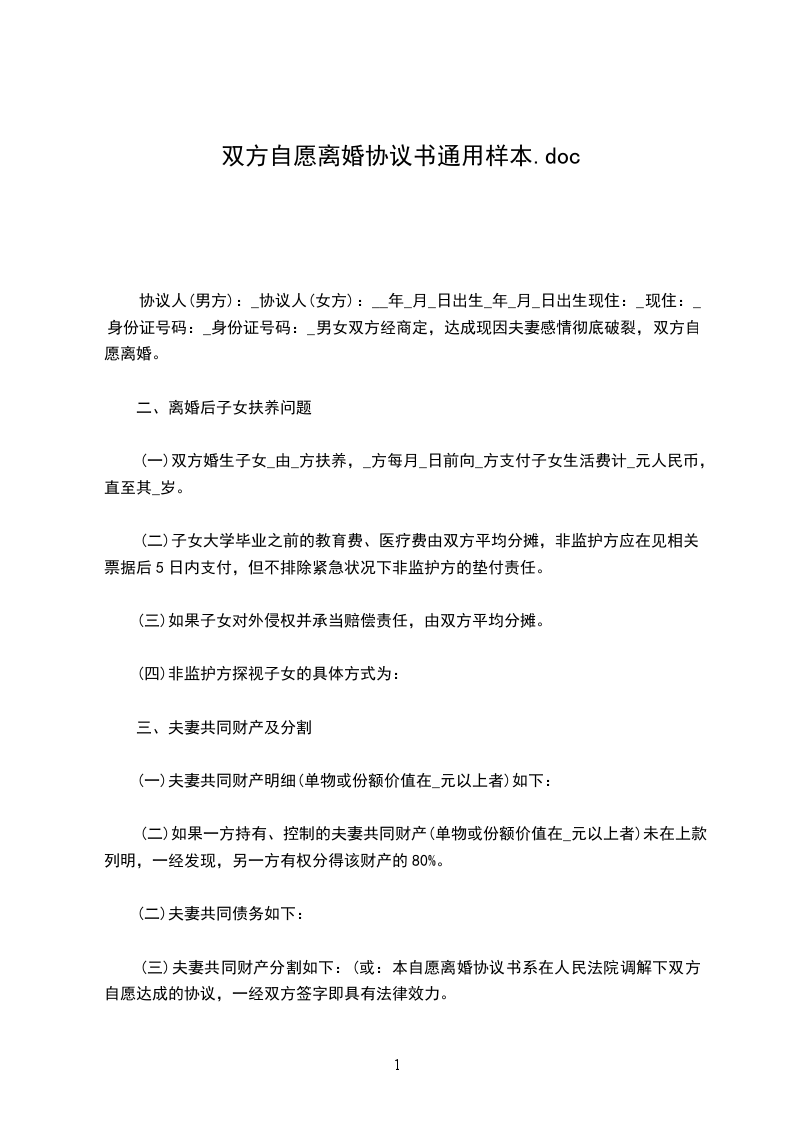 协议人(男方):_协议人(女方):__年_月_日出生_年_月_日出生现住:_现住:_身份证号码:_身份证号码:_男女双方经商定,达成现因夫妻感情彻底破裂,双方自愿离婚。