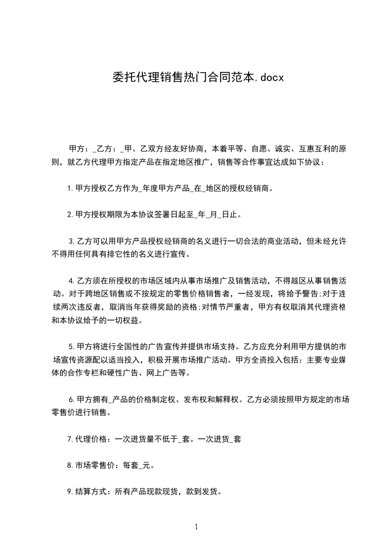 甲方:_乙方:_甲、乙双方经友好协商,本着平等、自愿、诚实、互惠互利的原则,就乙方代理甲方指定产品在指定地区推广,销售等合作事宜达成如下协议: