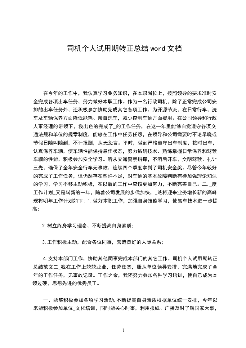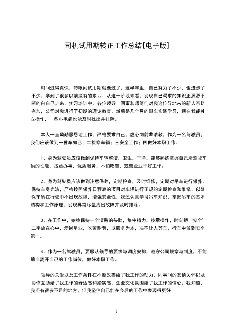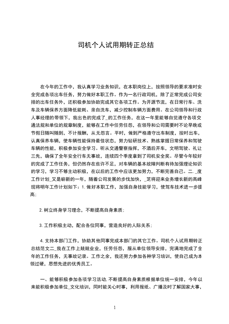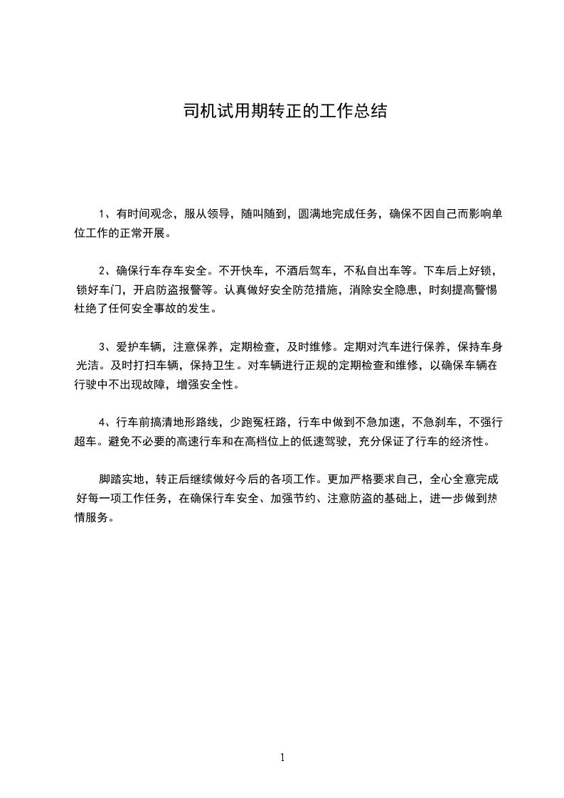 三、严格公司各项规章制度,全力做好服务工作作为一名司机,一年来我能明确自己的工作职责,遵循职业道德规范。在工作中严格按照各项规章制度,坚持个人利益服从全局利益,增强时间观念,服从领导,做到不迟到,不早退,不误事。在工作中任劳任怨,只要有需要时早晚或节假日都能随叫随到,不计报酬从无怨言;在资料文件的传递工作,做到及时传递无差错,较好地完成了领导和同事所交给的工作和任务。_已经过去,我在安全驾驶方面和日常工作取得了一定成效,也得到了公司领导和同事们的肯定。但是我也深知与领导的要求相比,还存在一定的差距,在新的一年里,我将会发扬优势,克服不足,努力学习,不断提高自己,进一步增强服务意识,争取公司的发展做出更大的贡献。有人说选择了司机就选择了辛苦,我今后也必将长期将与这一清苦的职业为伴,但我决不言悔,因为我愿意为我所从事的事业付出满腔热忱、捧出全部真诚,愿意为我挚爱工作奉献一切。司机个人试用期转正总结范XX在一年的驾驶工作中,我严格遵守道路安全相关法规和有关章程,并在工作中不但学习新的车辆维护、维修技术和驾驶技能,在驾驶实践中逐渐树立起“严守规章、安全第一”的观念,认真完成公司交派的各项工作,一年来从未出现过重大安全责任事故。回顾多年的工作,我主要作了以下几个方面: