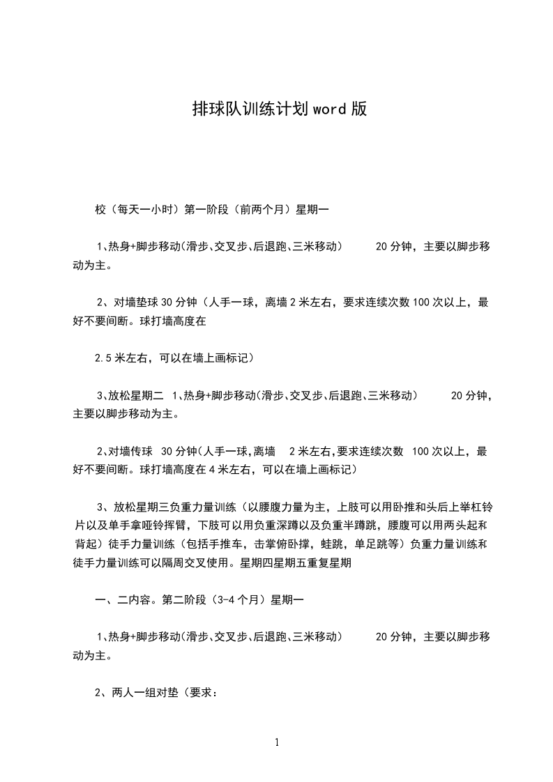 4放松星期三负重力量训练(以腰腹力量为主,上肢可以用卧推和头后上举杠铃片以及单手拿哑铃挥臂,下肢可以用负重深蹲以及负重半蹲跳,腰腹可以用两头起和背起)徒手力量训练(包括手推车,击掌俯卧撑,蛙跳,单足跳等)负重力量训练和徒手力量训练可以隔周交叉使用。星期四星期五在进行完热身和传点球练习后可加上拦网专门练习,也可以两人拦其他人扣球,被拦到的扣球队员下来拦网。但是要注意这个时候扣球时的传球队员一定是你选出的两三个二传手,尤其是主力二传。第四阶段除开热身和脚步移动还有力量训练时间要保证之外可根据学生情况对其他练习进行调整,加上战术练习,这个时候就要看陆XX的能力了,正常情况下经过这几个月的训练学生已经基本成型,可以打出一些简单的战术配合。