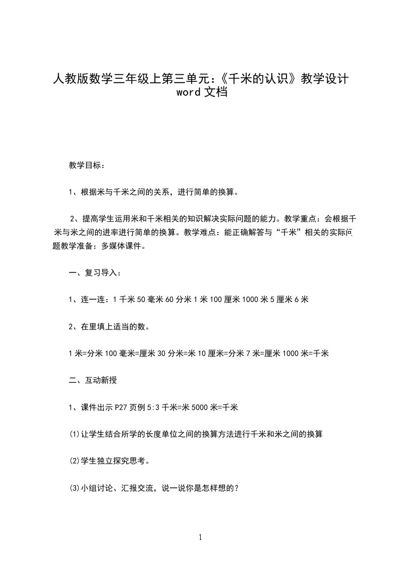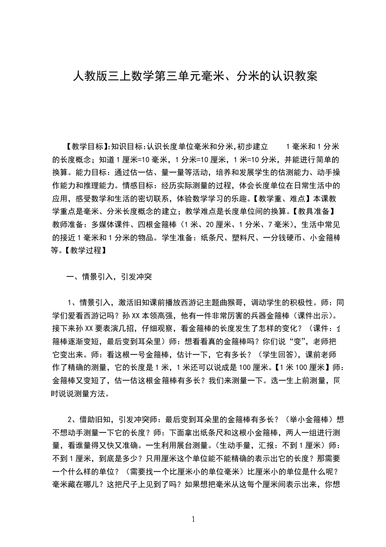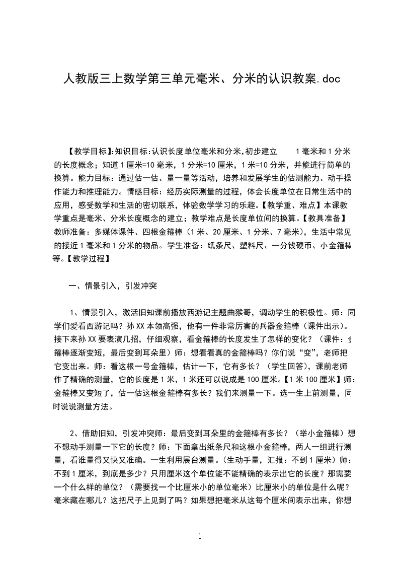 一、复习导入师:谁来说说我们已经学习了哪些长度单位?(米、厘米、毫米)练习:请填上适当的长度单位。(课件出示)一只蚂蚁长约5(毫米)一只长颈鹿高约2(米)一只小花猫高约40(厘米)一头大灰狼长约8质疑:一头大灰狼长约8,学过的长度单位都不能用。