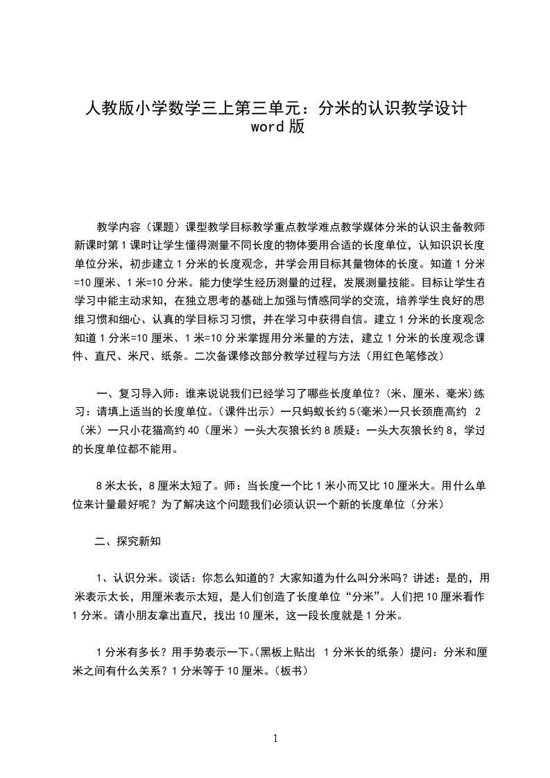 教学内容(课题)课型教学目标教学重点教学难点教学媒体分米的认识主备教师新课时第1课时让学生懂得测量不同长度的物体要用合适的长度单位,认知识识长度单位分米,初步建立1分米的长度观念,并学会用目标其量物体的长度。知道1分米=10厘米、1米=10分米。能力使学生经历测量的过程,发展测量技能。目标让学生在学习中能主动求知,在独立思考的基础上加强与情感同学的交流,培养学生良好的思维习惯和细心、认真的学目标习习惯,并在学习中获得自信。建立1分米的长度观念,知道1分米=10厘米、1米=10分米掌握用分米量的方法,建立1分米的长度观念课件、直尺、米尺、纸条。二次备课修改部分教学过程与方法(用红色笔修改)