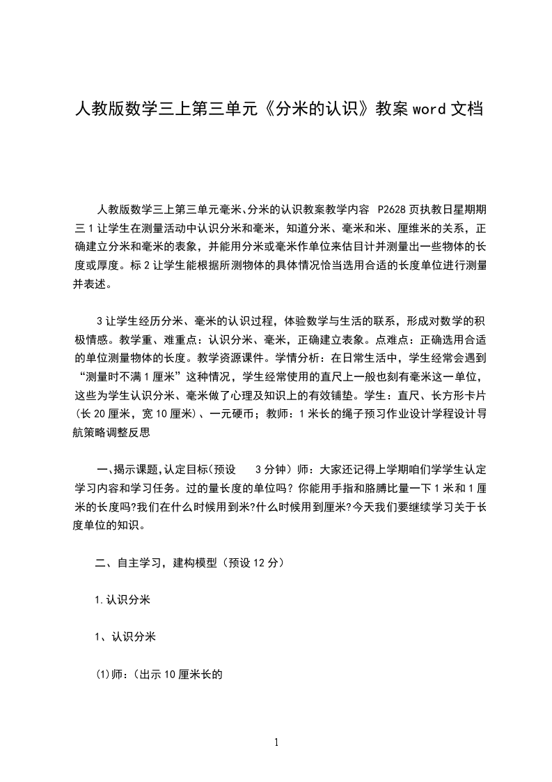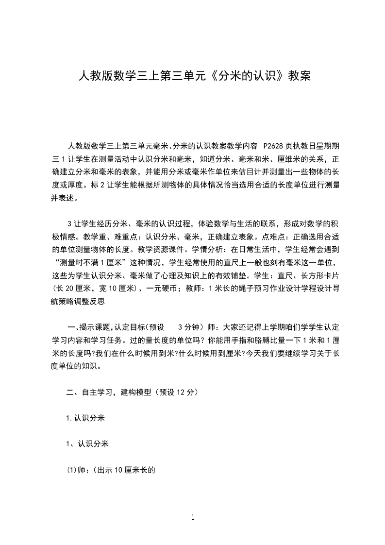 1、认识分米。谈话:你怎么知道的?大家知道为什么叫分米吗?讲述:是的,用米表示太长,用厘米表示太短,是人们创造了长度单位“分米”。人们把10厘米看作1分米。请小朋友拿出直尺,找出10厘米,这一段长度就是1分米。