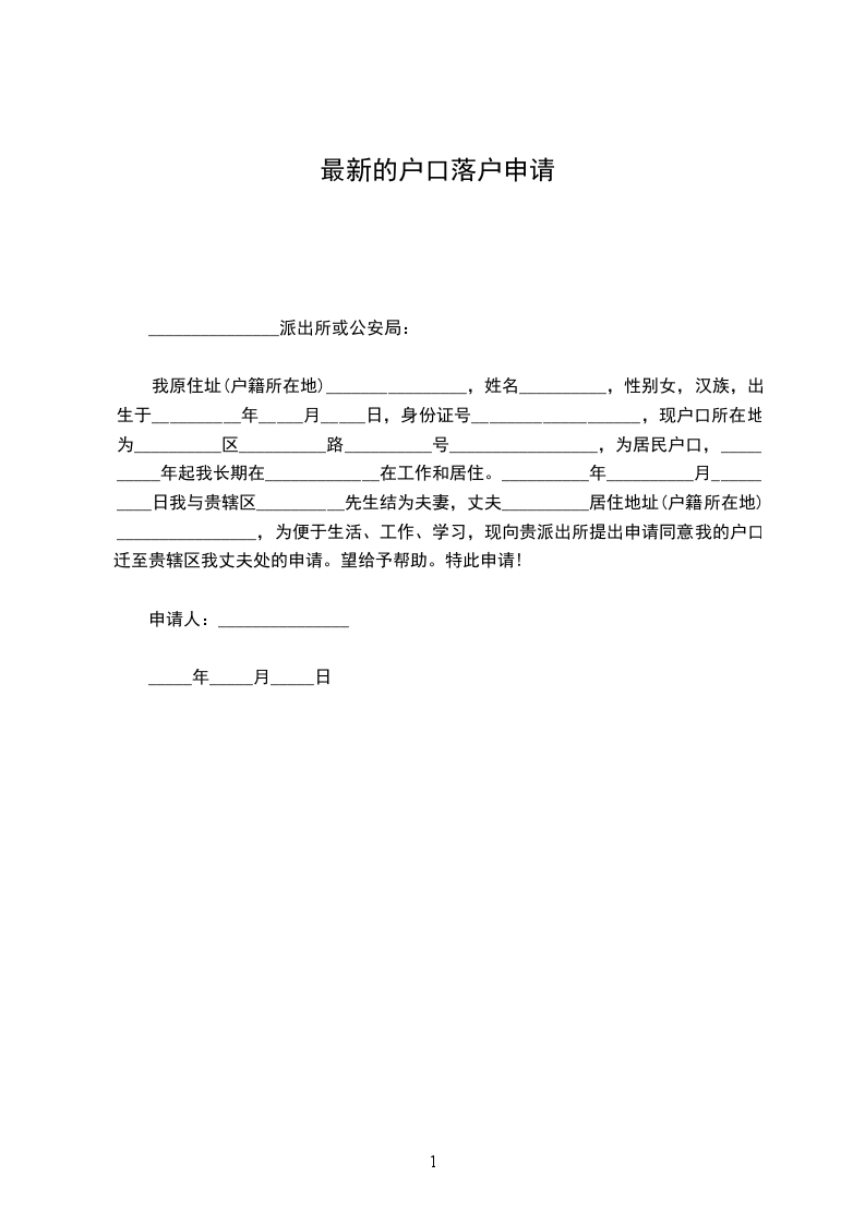 我原住址(户籍所在地)________________,姓名__________,性别女,汉族,出生于__________年_____月_____日,身份证号___________________,现户口所在地为__________区__________路__________号_________________,为居民户口,__________年起我长期在_____________在工作和居住。__________年__________月__________日我与贵辖区__________先生结为夫妻,丈夫__________居住地址(户籍所在地)________________,为便于生活、工作、学习,现向贵派出所提出申请同意我的户口迁至贵辖区我丈夫处的申请。望给予帮助。特此申请!
