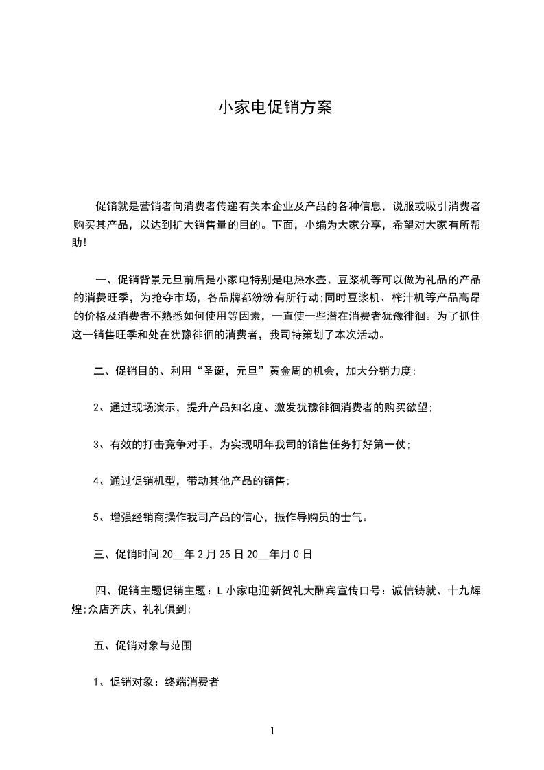 一、促销背景元旦前后是小家电特别是电热水壶、豆浆机等可以做为礼品的产品的消费旺季,为抢夺市场,各品牌都纷纷有所行动;同时豆浆机、榨汁机等产品高昂的价格及消费者不熟悉如何使用等因素,一直使一些潜在消费者犹豫徘徊。为了抓住这一销售旺季和处在犹豫徘徊的消费者,我司特策划了本次活动。