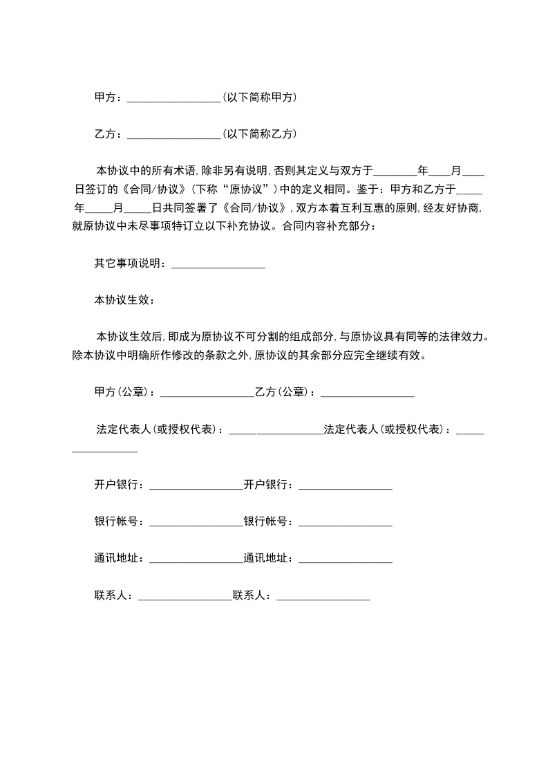 本协议中的所有术语,除非另有说明,否则其定义与双方于________年____月____日签订的《合同/协议》(下称“原协议”)中的定义相同。鉴于:甲方和乙方于_____年_____月_____日共同签署了《合同/协议》,双方本着互利互惠的原则,经友好协商,就原协议中未尽事项特订立以下补充协议。合同内容补充部分: