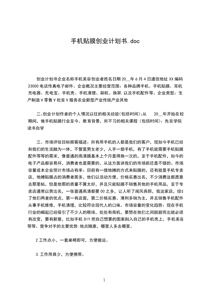 创业计划书企业名称手机美容创业者姓名日期20__年6月4日通信地址XX编码23000电话传真电子邮件、企业概况主要经营范围:各种品牌手机、手机贴膜、耳机、充电器、充电宝、手机壳、手机清理、刷机、换屏,以及手机配件等。企业类型:生产制造V零售V批发V服务农业新型产业传统产业其他