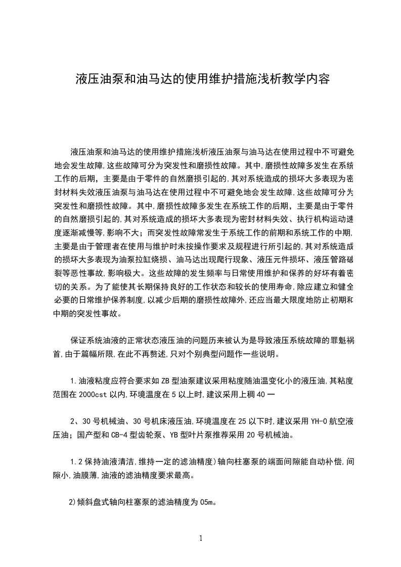 液压油泵和油马达的使用维护措施浅析液压油泵与油马达在使用过程中不可避免地会发生故障,这些故障可分为突发性和磨损性故障。其中,磨损性故障多发生在系统工作的后期,主要是由于零件的自然磨损引起的,其对系统造成的损坏大多表现为密封材料失效液压油泵与油马达在使用过程中不可避免地会发生故障,这些故障可分为突发性和磨损性故障。其中,磨损性故障多发生在系统工作的后期,主要是由于零件的自然磨损引起的,其对系统造成的损坏大多表现为密封材料失效、执行机构运动速度逐渐减慢等,影响不大;而突发性故障常发生于系统工作的前期和系统工作的中期,主要是由于管理者在使用与维护时未按操作要求及规程进行所引起的,其对系统造成的损坏大多表现为油泵拉缸烧损、油马达出现爬行现象、液压元件损坏、液压管路破裂等恶性事故,影响极大。这些故障的发生频率与日常使用维护和保养的好坏有着密切的关系。为了能使其长期保持良好的工作状态和较长的使用寿命,除应建立和健全必要的日常维护保养制度,以减少后期的磨损性故障外,还应当最大限度地防止初期和中期的突发性事故。