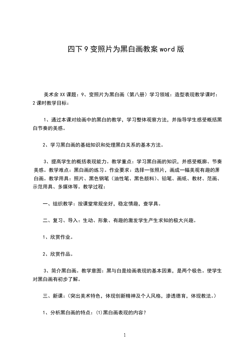 美术余XX课题:9、变照片为黑白画(第八册)学习领域:造型表现教学课时:2课时教学目标: