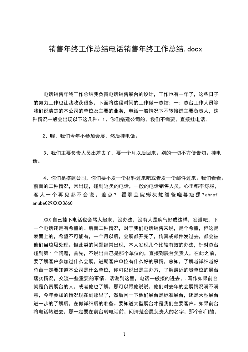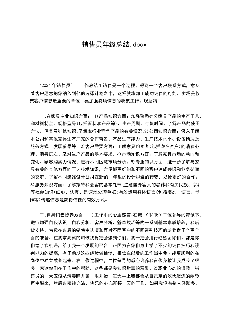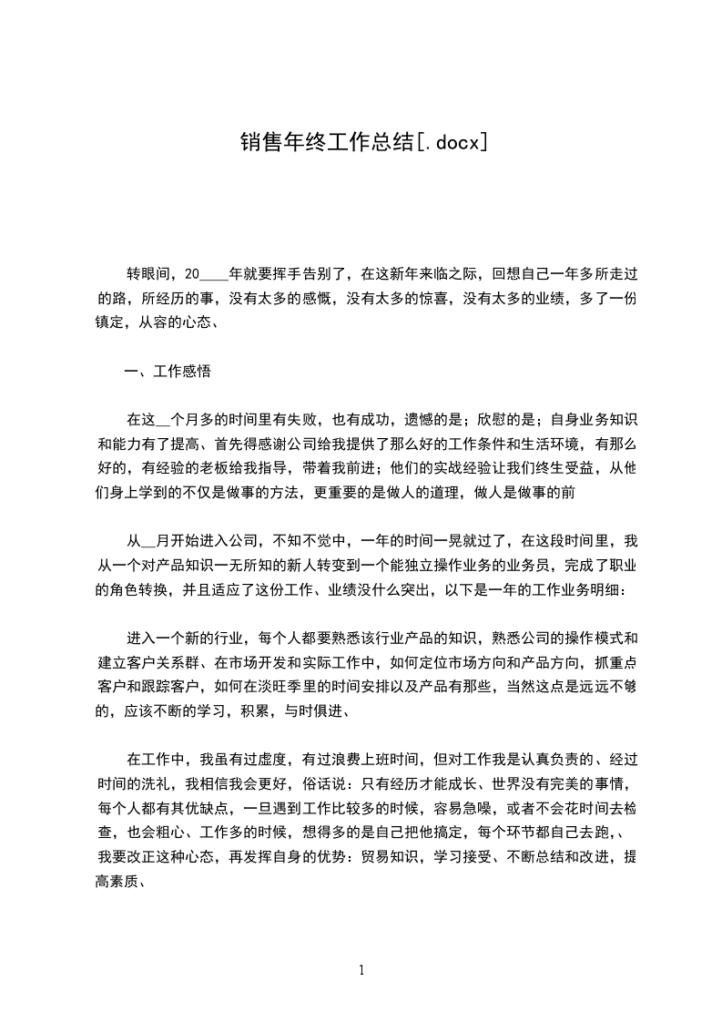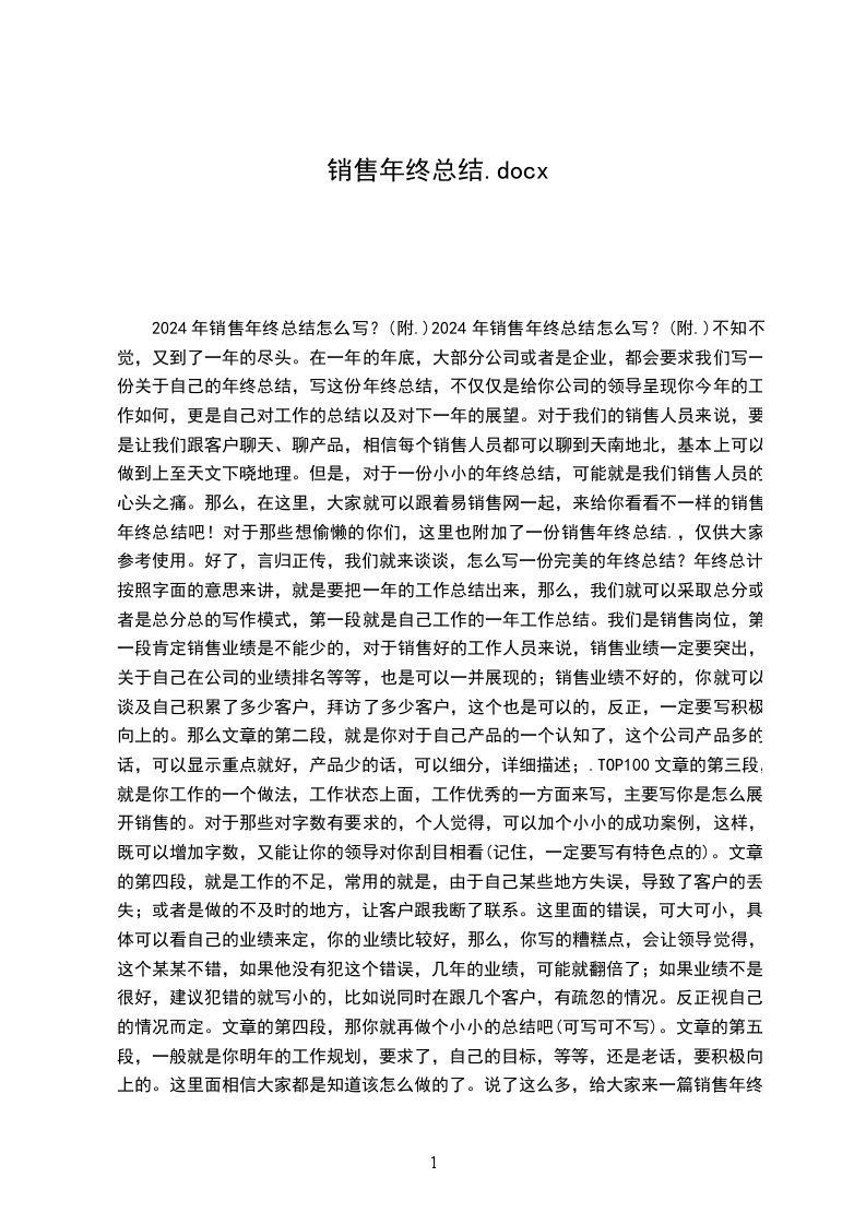 2024年销售年终总结怎么写?(附.)2024年销售年终总结怎么写?(附.)不知不觉,又到了一年的尽头。在一年的年底,大部分公司或者是企业,都会要求我们写一份关于自己的年终总结,写这份年终总结,不仅仅是给你公司的领导呈现你今年的工作如何,更是自己对工作的总结以及对下一年的展望。对于我们的销售人员来说,要是让我们跟客户聊天、聊产品,相信每个销售人员都可以聊到天南地北,基本上可以做到上至天文下晓地理。但是,对于一份小小的年终总结,可能就是我们销售人员的心头之痛。那么,在这里,大家就可以跟着易销售网一起,来给你看看不一样的销售年终总结吧!对于那些想偷懒的你们,这里也附加了一份销售年终总结.,仅供大家参考使用。好了,言归正传,我们就来谈谈,怎么写一份完美的年终总结?年终总计,按照字面的意思来讲,就是要把一年的工作总结出来,那么,我们就可以采取总分或者是总分总的写作模式,第一段就是自己工作的一年工作总结。我们是销售岗位,第一段肯定销售业绩是不能少的,对于销售好的工作人员来说,销售业绩一定要突出,关于自己在公司的业绩排名等等,也是可以一并展现的;销售业绩不好的,你就可以谈及自己积累了多少客户,拜访了多少客户,这个也是可以的,反正,一定要写积极向上的。那么文章的第二段,就是你对于自己产品的一个认知了,这个公司产品多的话,可以显示重点就好,产品少的话,可以细分,详细描述;.TOP100文章的第三段,就是你工作的一个做法,工作状态上面,工作优秀的一方面来写,主要写你是怎么展开销售的。对于那些对字数有要求的,个人觉得,可以加个小小的成功案例,这样,既可以增加字数,又能让你的领导对你刮目相看(记住,一定要写有特色点的)。文章的第四段,就是工作的不足,常用的就是,由于自己某些地方失误,导致了客户的丢失;或者是做的不及时的地方,让客户跟我断了联系。这里面的错误,可大可小,具体可以看自己的业绩来定,你的业绩比较好,那么,你写的糟糕点,会让领导觉得,这个某某不错,如果他没有犯这个错误,几年的业绩,可能就翻倍了;如果业绩不是很好,建议犯错的就写小的,比如说同时在跟几个客户,有疏忽的情况。反正视自己的情况而定。文章的第四段,那你就再做个小小的总结吧(可写可不写)。文章的第五段,一般就是你明年的工作规划,要求了,自己的目标,等等,还是老话,要积极向上的。这里面相信大家都是知道该怎么做的了。说了这么多,给大家来一篇销售年终总结.,可供大家参考。2024年销售年终总结光阴似箭,日月如梭。伴随着新年钟声的临近,我们依依惜别了紧张、忙碌的2024年,思想汇报专题满怀热情和期待的迎来了光明灿烂、虎跃腾飞、充满希望和_的2024年。一转眼,来了XX公司也快一个季度了。回顾这几个月以来所做的工作,心里颇有几份感触。在过去的几个月里,首先我要提到两个人,冯X和陈X。首先感谢冯X给予我们这样一个发展的平台,和用心培养;感谢陈X给予工作上的鼓励和督促。在二位领导的引领下,我们这个团队学到了很多的业务谈判知识和商谈技巧,并顺利的为下一步的公司业务发展迈出了第一步。其次感谢这个业务团队,感谢同事们在工作上的相互鼓励和配合。他们所有人都有值得我去学习地方,我从们身上学到了不少知识,让自己更加的成熟。这几个月里不断与公司业务模式进行磨合,我为自己能成为达XX公司的一名业务销售人员深感荣幸和自豪。我也更加的认识到了,一个销售人员的知识面、社交能力和商务谈判技巧决定了销售人员的销售能力。为此,我经过查阅更多产品手册、行业资料、相关书籍和参加公司会议培训,在公司销售行业自身知识面层次上得到了一个更好的提高,并认识到自己现有的不足和长处。.以下我想说三个方面:一、在专业知识方面:1)产品知识方面:加强熟悉产品的生产工艺、和材料特点、规格型号(包括面料和产品等)、生产周期、付货时间。了解产品的使用方法、保养及维修知识;了解本行业竞争产品的有关情况;2)公司知识方面:深入了解本公司和其他公司的合作背景、产品生产能力、生产技术水平、设备情况及服务方式、发展前景等。3)客户需要方面:了解名录购买者(包括潜在客户)的消费心理、消费层次、及对生产产品的基本要求。4)市场知识方面:了解.市场的动向和变化、顾客购买力情况,进行不同区域市场分析。5)专业知识方面:进一步了解与.有关的其他方面的工艺技术知识,方便能更好的和不同的客户达成共识和业务范畴的交流,了解不同公司在新的一年里的设计思维的转变,以便更好的合作。6)服务知识方面:了解接待和会客的基本礼节(注意国外客人的忌讳和有关民族、宗教等.知识)细心、认真、迅速地处理单据;有效运用身体语言(包括姿态、语言、动作等)传递信息是获得信任的有效方式。