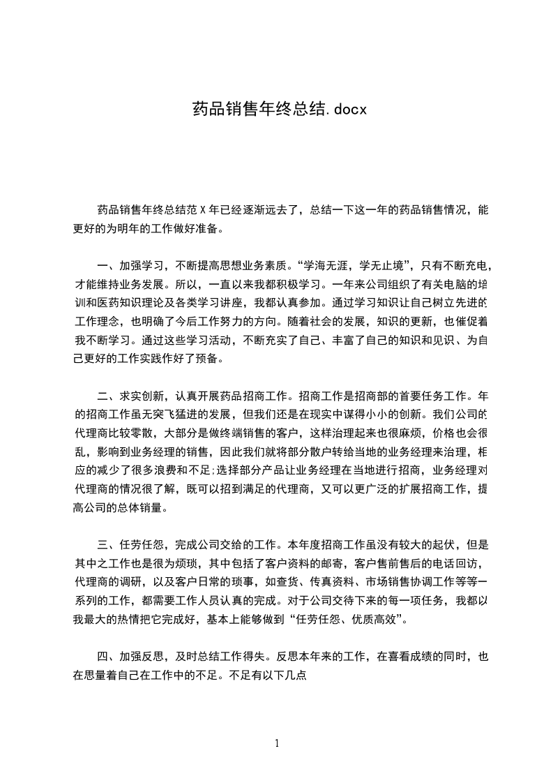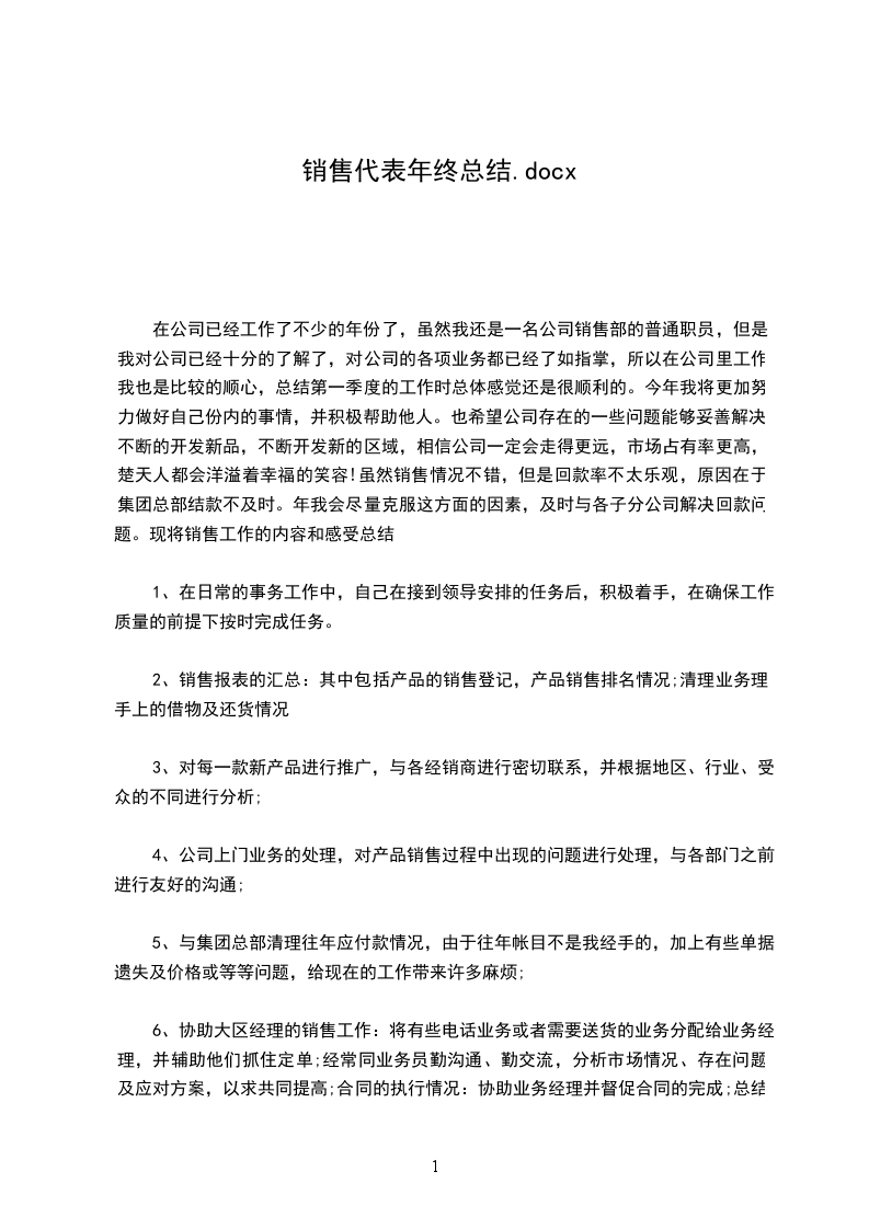 7、品开发速度太慢。值得一提的事上半年同比已经有了很大的进步通过全体员工的共同努力,公司各项工作取得了全面胜利,各项经营指标均创历史新高。这是值得鼓舞的。可是我们还要做得更好更强大,今年我将更加努力做好自己份内的事情,并积极帮助他人。也希望公司存在的一些问题能够妥善解决,不断的开发新品,不断开发新的区域,相信公司一定会走得更远!篇三:2024年销售年终工作总结.2024年销售年终工作总结.自从转到销售部至今已经一年半了,回想自己这一年多所走过的路,所经历的事情,没有太多的感慨,没有太多的惊喜,多了一份镇定,从容的心态。在公司领导的带领和帮助下,加之部门同事的鼎力协助,自己立足本职工作,使得销售工作得及顺利进行。虽然销售情况不错,但是回款率不太乐观,原因在于集团总部结款不及时。2024年我会尽量克服这方面的因素,及时与各子分公司解决回款问题。现将销售工作的内容和感受总结如下:平时公司上门业务的处理,对产品销售过程中出现的问题进行处理,与各部门之前进行友好的沟通,与集团总部清理往年应付款情况,由于往年帐目不是我经手的,加上有些单据遗失及价格或等等问题,给现在的工作带来许多麻烦,对每一款新产品进行推广,与各经销商进行密切联系,并根据地区、行业、受众的不同进行分析,在日常的事务工作中,自己在接到领导安排的任务后,积极着手,在确保工作质量的前提下按时完成任务。总结一年来的工作,自己的工作仍存在很多问题和不足,在工作方法和技巧上有待于向其他业务员和同行学习,2024年自己计划在去年工作得失的基础上取长补短,重点做好以下几个方面的工作:1、全年销售任务,平时积极搜集信息并及时汇总;