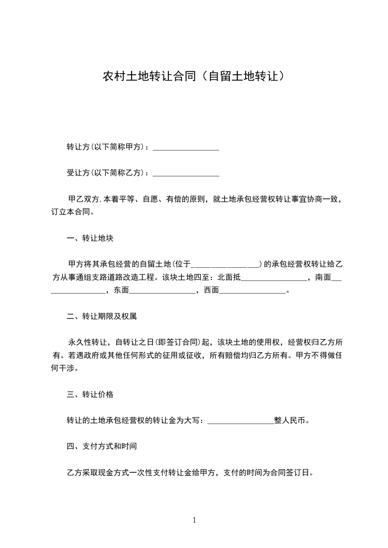 甲方将其承包经营的自留土地(位于_________________)的承包经营权转让给乙方从事通组支路道路改造工程。该块土地四至:北面抵_________________,南面_________________,东面_________________,西面_________________。