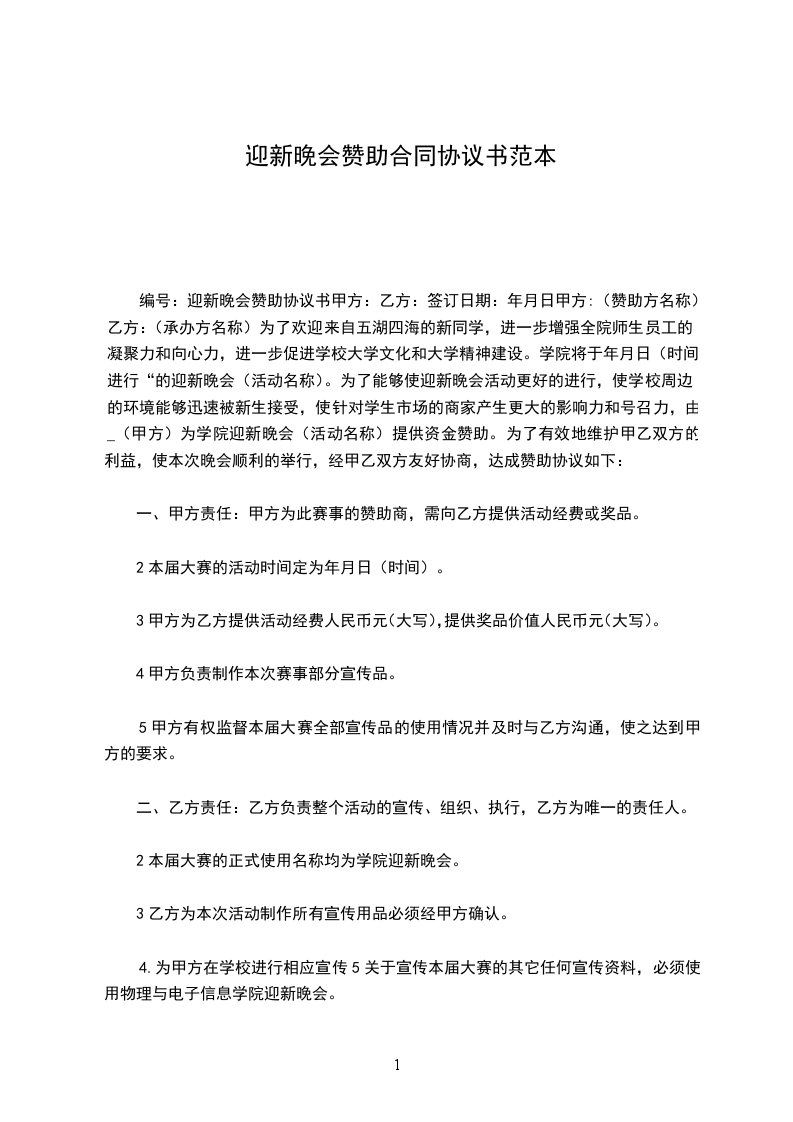 编号:迎新晚会赞助协议书甲方:乙方:签订日期:年月日甲方:(赞助方名称)乙方:(承办方名称)为了欢迎来自五湖四海的新同学,进一步增强全院师生员工的凝聚力和向心力,进一步促进学校大学文化和大学精神建设。学院将于年月日(时间)进行“的迎新晚会(活动名称)。为了能够使迎新晚会活动更好的进行,使学校周边的环境能够迅速被新生接受,使针对学生市场的商家产生更大的影响力和号召力,由_(甲方)为学院迎新晚会(活动名称)提供资金赞助。为了有效地维护甲乙双方的利益,使本次晚会顺利的举行,经甲乙双方友好协商,达成赞助协议如下: