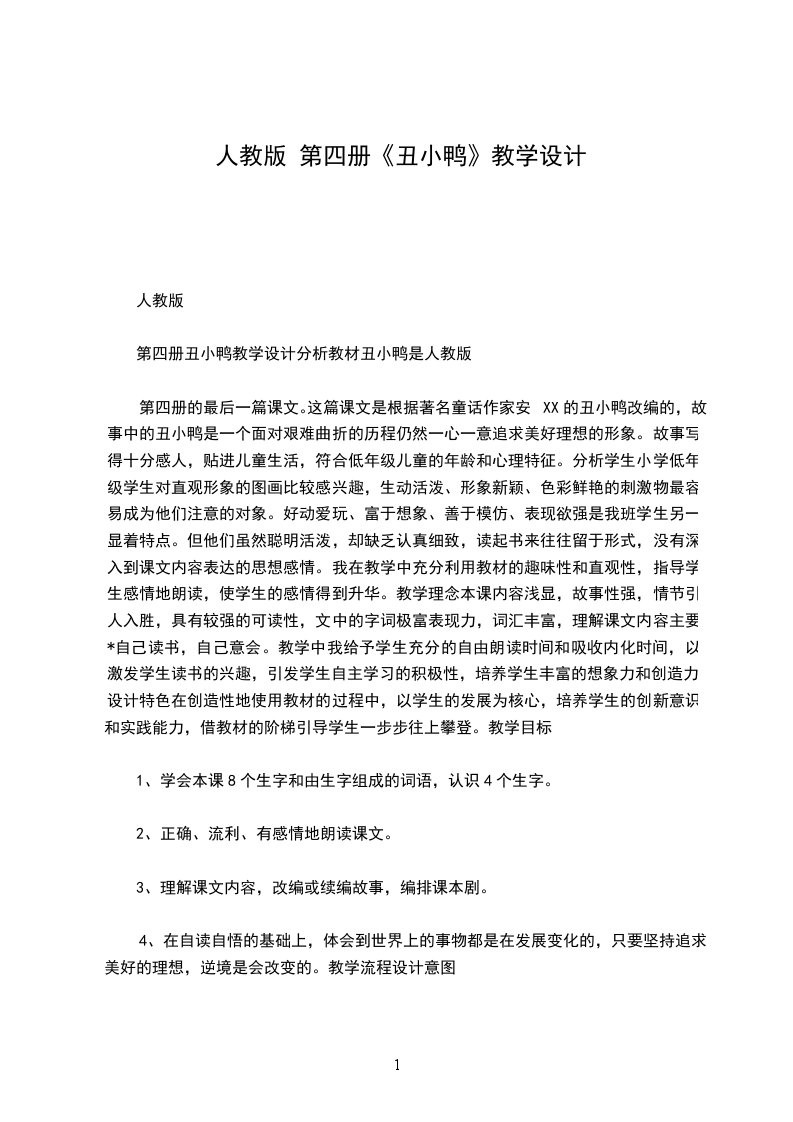 三、情感态度与价值观懂得善待他人,尊重他人,同时正确地认识自己。教学重点、难点重点:正确、流利、有感情地朗读课文,读懂课文内容。难点:通过了解丑小鸭的经历,领悟童话的教育意义。教学资源多媒体课件教学过程