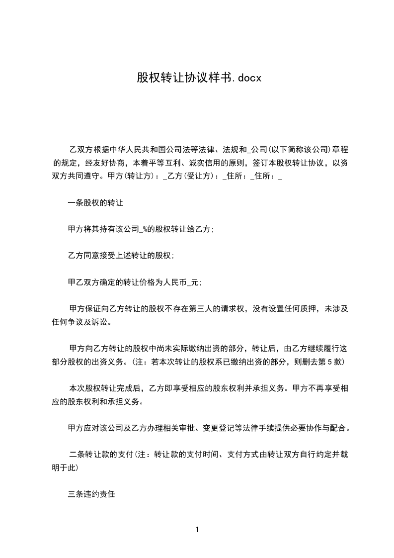 乙双方根据中华人民共和国公司法等法律、法规和_公司(以下简称该公司)章程的规定,经友好协商,本着平等互利、诚实信用的原则,签订本股权转让协议,以资双方共同遵守。甲方(转让方):_乙方(受让方):_住所:_住所:_
