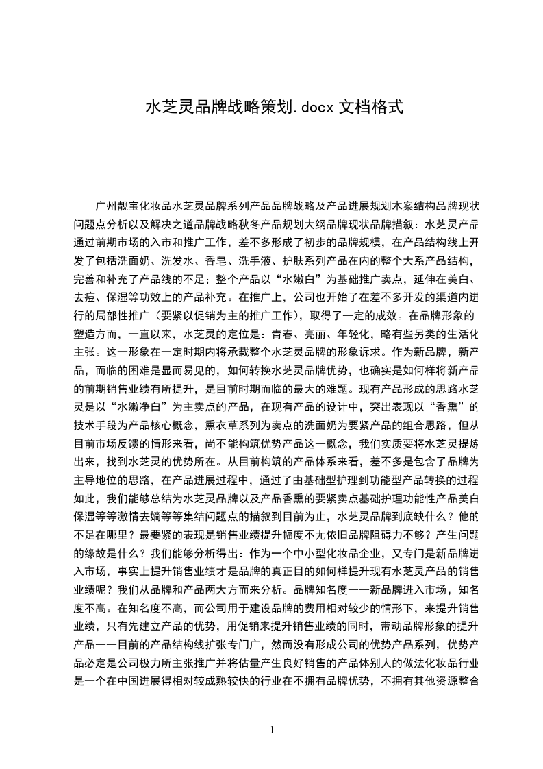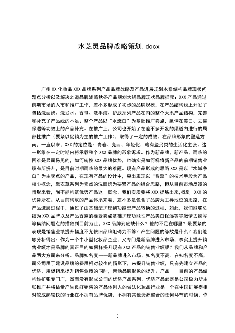 二、将“水XX”塑造在与“水”相挂钩的品牌联想上,制造一个“水精灵”的品牌联想造型,提出“水润润,更健康”的品牌主张。完善基础的品牌识别。由“天然的,健康的,润水的”由此导出公司产品的主张和进展方向,水芝灵新产品策划功能:重点推广补水的概念,以复合型的产品概念切入市场。产品:膏霜、水类、品牌主诉:肌肤补水元素产品线:营养全效补水清新祛痘高能补水美白产品说明产品说明营养全效补水Fl霜一款,35克,价格较低,以全效补水为主体概念清新祛痘凝胶80克。中低价位营养全效补水晚霜一款,35克,价格较低,以全效补水为主体概念,突出产品差别清新祛痘爽肤水35克,与凝胶配套高能补水美口霜50克,价位较高奇异暗仓水跟风李大夫产品的优势产品系列高能补水凝露25克。与霜形成配套高能营养水20克,价位较高,配套产品产品开发思路从目前市场行情综观来看,补水产品拥有在护肤产品中较为宽敞的市场,目前的补水产品集中在“赶忙补水”“快速补水”“持久补水”“全效补水”“完全补水”“补充离子水”“极度补水”的概念上。如何创新水芝灵的补水观念,是“标新立异”话战略的第一步。补什么水?补充高能复合的蛋口水,具有弱酸性,如何补?通过高能渗透,与肌肤弱酸性的亲和,解决肌肤缺水,缺酸的缘故,从五重肌肤补水上深入。有什么利益?润水生白,水润生香。使肌肤具有天然水润光泽。变得圆润,嫩滑什么卖点?香熏提炼柠檬酸,形成按摩和渗透,提倡健康才是美。要紧工作任务描叙: