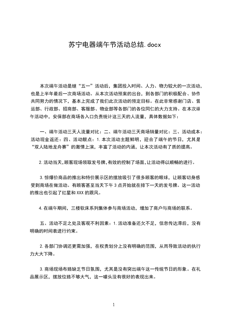 本次端午活动是继“五一”活动后,集团投入时间、人力、物力较大的一次活动,也是上半年最后一次商场活动。从本次活动预案的出台,到各部门的积极配合、协作共同努力的情况下,基本上完成了我们此次活动的预定目标。在此非常感谢门店、营运部、行政部、招商部、客服部、物业部等各部门的各位同仁的大力支持。在本次端午活动中,安保部在商场各入口负责统计这三天的人流量,具体数据如下:
