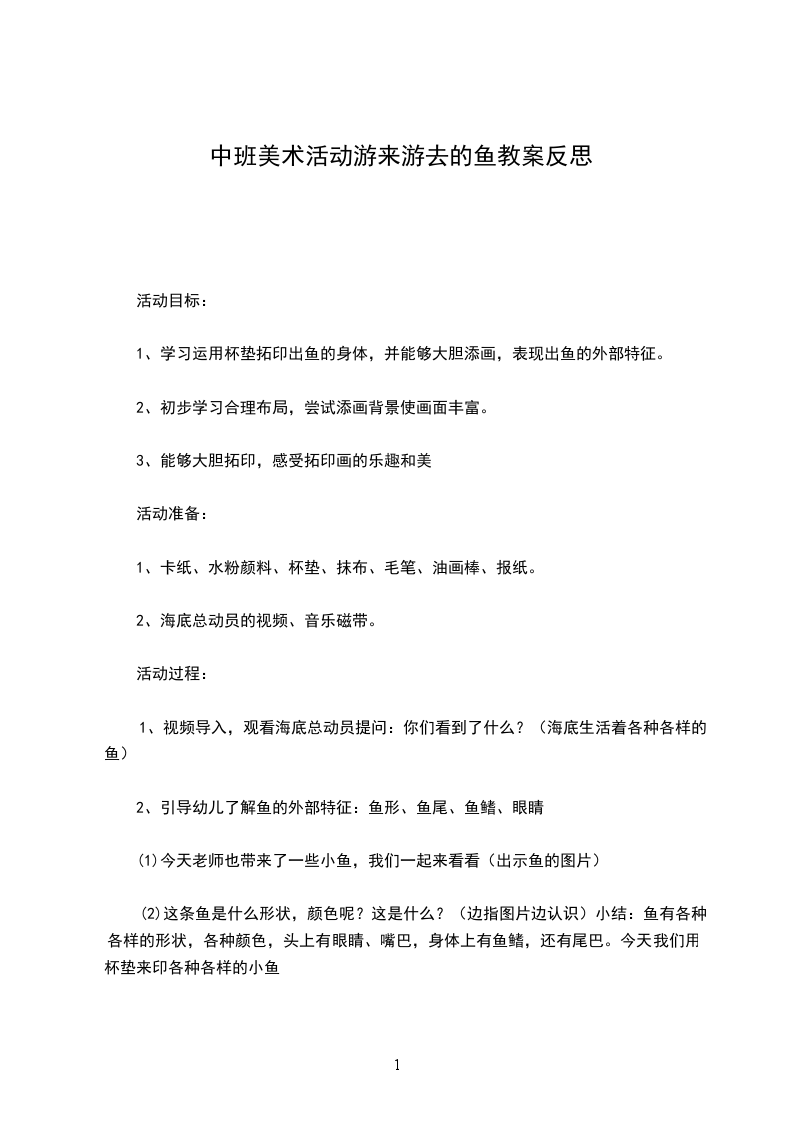 3、赏析名家画作。(一幅国画、一幅油画。)师:这些色彩斑斓又非常漂亮的鱼也引起了艺术家的联想,看看他们是怎样表现鱼的?(欣赏)大家看,这幅是什么画?国画:(毛笔蘸着水和墨来画的)这幅呢?是油画(画笔蘸着油彩画的),画家笔下的鱼给你什么感觉?生1:像真的一样。师:是呀,活灵活现,非常生动。生2:花纹也很漂亮师小结:所以人们称这些美丽的鱼儿为“会游动的花”。【设计意图:交流有关鱼的知识,让他们比较自然界中的鱼和画家笔下的鱼,感受鱼的美,同时培养了孩子们的观察能力、分析能力和鉴赏能力,并对鱼的形状有进一步了解】