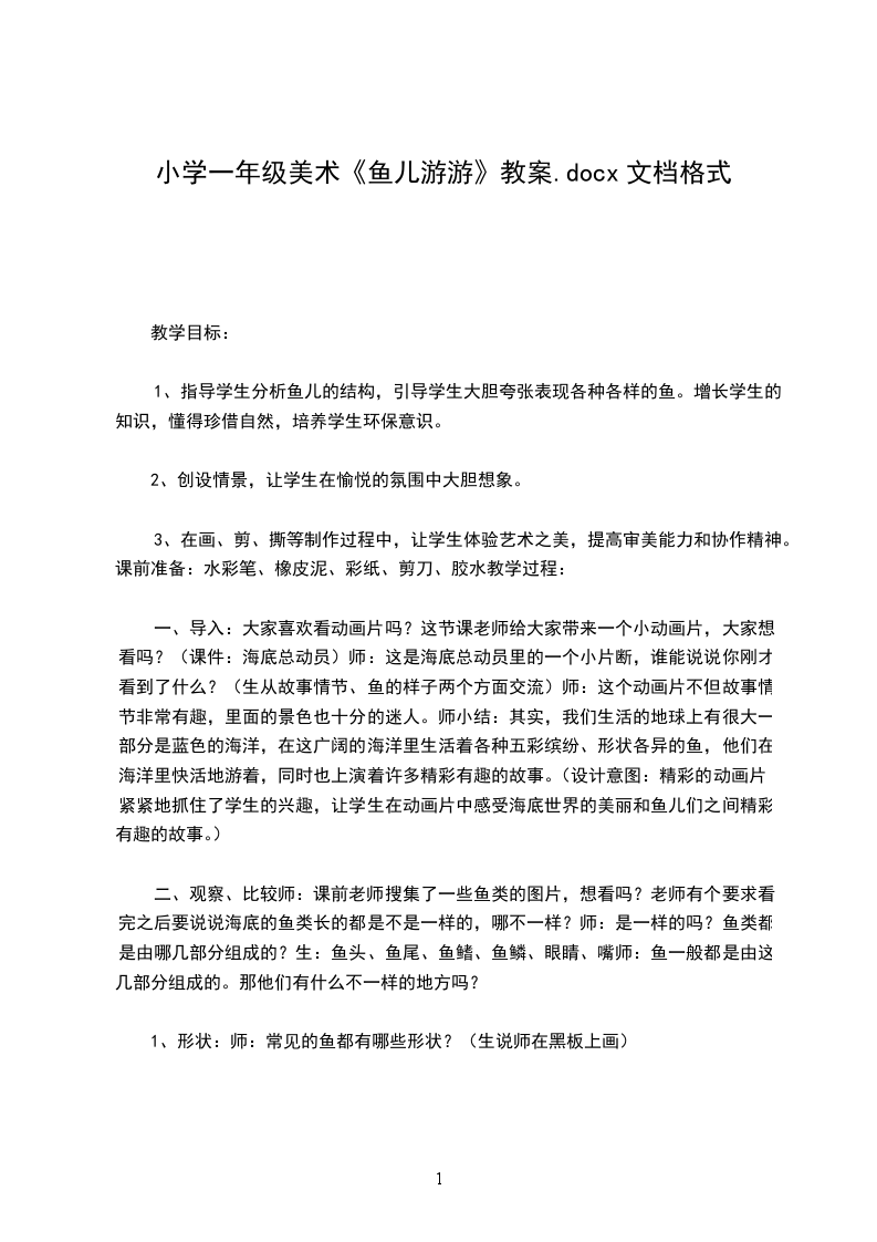 二、教材分析:自然界的鱼类有各种各样的形状,色彩也是五光十色。教师通过带领学生欣赏海底世界的鱼、画家笔下的鱼和他们同龄孩子的优秀画作,引导学生表现鱼儿的欲望,启发他们用自己手中的画笔来描绘出各种美丽的鱼儿,和鱼儿做听,这是什么声音?(听鱼儿活动音乐)生:这是小鱼吐泡泡的声音。师:你见过小鱼吐泡泡吗?它是什么颜色的?(板画彩色的泡)(出示动画小鱼)多可爱的小鱼儿,在水里吐着一串串小水泡。摆着小尾巴游来游去。多自在啊!你能像他一样吗?那我们一起来做做吧!全体起立。让我们随着音乐游起来吧!看看那条小鱼游的最可爱!(鱼儿游游音乐起,老师和学生一起做鱼儿游的律动)真是一个快乐的鱼儿大家族,快乐的小鱼们,请坐。今天的美术课,我们就一起来学习“鱼儿游游”(板书:鱼儿游游)【设计意图:在音乐声中师生互动,一体现了艺术课的特点轻松、愉悦,二体现了课堂教学中师生间的平等交流,三顺理成章地引出课题。】
