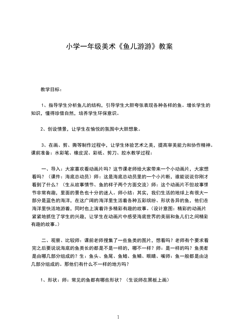 一、课标解读:新课程标准指出:美术教学要在课堂教学中从多方位、多角度促进学生全方面的发展,重视学生在创作过程中情感、态度、价值观等方面的培养和能力的发展。它留给学生的是拥有一种精神、一种立场、一种态度、一种不懈的追求。鱼儿游游这一课的设计上我力争达到这一点。通过欣赏优秀画作引导学生珍惜环境,关爱大自然,从小形成环保意识,给予他们一种精神和追求。因为本节课所用的材料和表现手法有很多种,课堂比较杂乱,所以我就选用了学生最常用表现方法画,让孩子去表现生活在水中自由自在的小鱼,而其他表现手法鼓励学生在课下尝试。