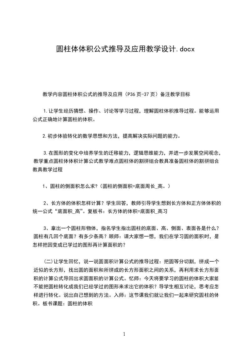 教学内容圆柱体积公式的推导及应用(P36页-37页)备注教学目标
