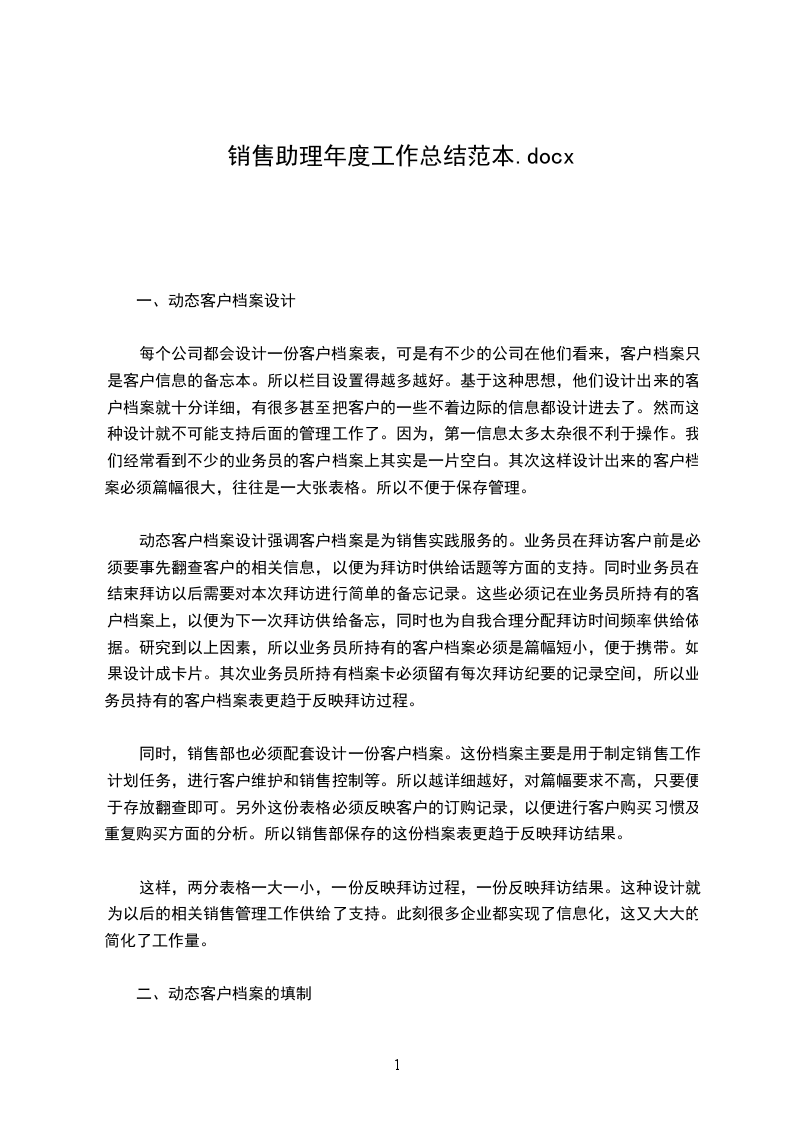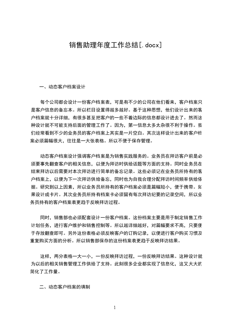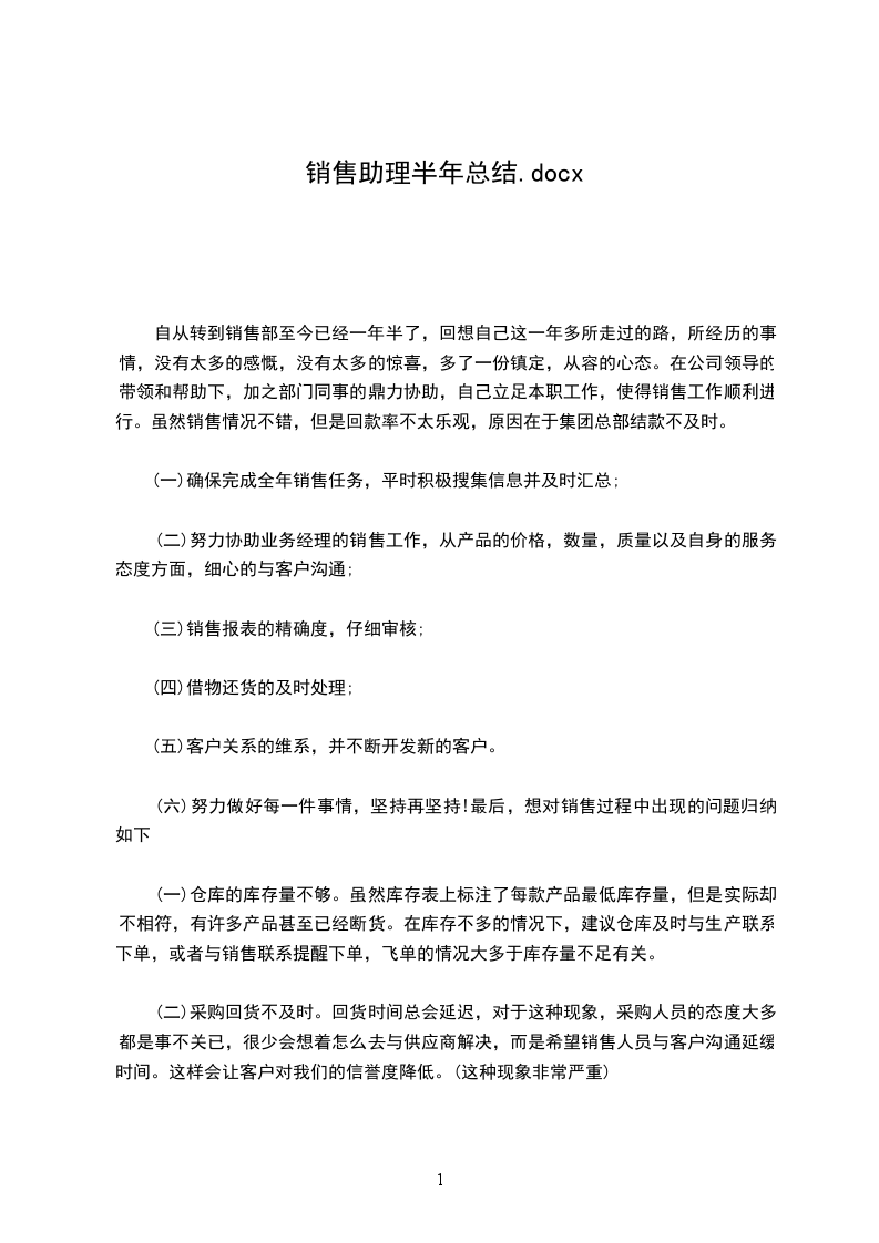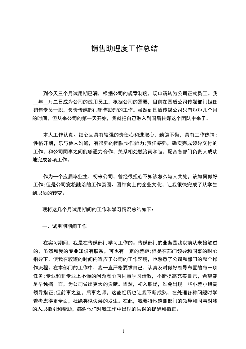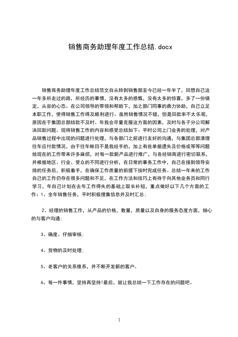 销售商务助理年度工作总结范文自从转到销售部至今已经一年半了,回想自己这一年多所走过的路,所经历的事情,没有太多的感慨,没有太多的惊喜,多了一份镇定,从容的心态。在公司领导的带领和帮助下,加之部门同事的鼎力协助,自己立足本职工作,使得销售工作得及顺利进行。虽然销售情况不错,但是回款率不太乐观,原因在于集团总部结款不及时。年我会尽量克服这方面的因素,及时与各子分公司解决回款问题。现将销售工作的内容和感受总结如下:平时公司上门业务的处理,对产品销售过程中出现的问题进行处理,与各部门之前进行友好的沟通,与集团总部清理往年应付款情况,由于往年帐目不是我经手的,加上有些单据遗失及价格或等等问题,给现在的工作带来许多麻烦,对每一款新产品进行推广,与各经销商进行密切联系,并根据地区、行业、受众的不同进行分析,在日常的事务工作中,自己在接到领导安排的任务后,积极着手,在确保工作质量的前提下按时完成任务。总结一年来的工作,自己的工作仍存在很多问题和不足,在工作方法和技巧上有待于向其他业务员和同行学习,年自己计划在去年工作得失的基础上取长补短,重点做好以下几个方面的工作:1、全年销售任务,平时积极搜集信息并及时汇总;