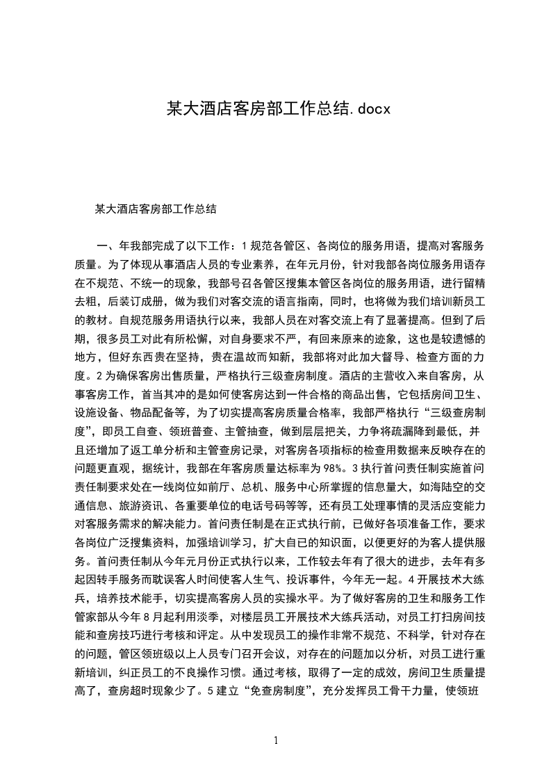 一、年我部完成了以下工作:1规范各管区、各岗位的服务用语,提高对客服务质量。为了体现从事酒店人员的专业素养,在年元月份,针对我部各岗位服务用语存在不规范、不统一的现象,我部号召各管区搜集本管区各岗位的服务用语,进行留精去粗,后装订成册,做为我们对客交流的语言指南,同时,也将做为我们培训新员工的教材。自规范服务用语执行以来,我部人员在对客交流上有了显著提高。但到了后期,很多员工对此有所松懈,对自身要求不严,有回来原来的迹象,这也是较遗憾的地方,但好东西贵在坚持,贵在温故而知新,我部将对此加大督导、检查方面的力度。2为确保客房出售质量,严格执行三级查房制度。酒店的主营收入来自客房,从事客房工作,首当其冲的是如何使客房达到一件合格的商品出售,它包括房间卫生、设施设备、物品配备等,为了切实提高客房质量合格率,我部严格执行“三级查房制度”,即员工自查、领班普查、主管抽查,做到层层把关,力争将疏漏降到最低,并且还增加了返工单分析和主管查房记录,对客房各项指标的检查用数据来反映存在的问题更直观,据统计,我部在年客房质量达标率为98%。3执行首问责任制实施首问责任制要求处在一线岗位如前厅、总机、服务中心所掌握的信息量大,如海陆空的交通信息、旅游资讯、各重要单位的电话号码等等,还有员工处理事情的灵活应变能力,对客服务需求的解决能力。首问责任制是在正式执行前,已做好各项准备工作,要求各岗位广泛搜集资料,加强培训学习,扩大自已的知识面,以便更好的为客人提供服务。首问责任制从今年元月份正式执行以来,工作较去年有了很大的进步,去年有多起因转手服务而耽误客人时间使客人生气、投诉事件,今年无一起。4开展技术大练兵,培养技术能手,切实提高客房人员的实操水平。为了做好客房的卫生和服务工作,管家部从今年8月起利用淡季,对楼层员工开展技术大练兵活动,对员工打扫房间技能和查房技巧进行考核和评定。从中发现员工的操作非常不规范、不科学,针对存在的问题,管区领班级以上人员专门召开会议,对存在的问题加以分析,对员工进行重新培训,纠正员工的不良操作习惯。通过考核,取得了一定的成效,房间卫生质量提高了,查房超时现象少了。5建立“免查房制度”,充分发挥员工骨干力量,使领班有更多时间与精力将重心放在管理和员工的培训工作上。为了使员工对客房工作加深认识,加强员工的责任心,今年10月份,管家部与各班组的员工骨干签定免查房协议,让员工对自己的工作进行自查自纠,并让员工参与管理,负责领班休假期间的代班工作,充分体现出员工的自身价值和酒店对他们的信任,使员工对工作更有热情。到目前为止,4人申请免查房中无一人出现过大的工作失误。如此一来,减轻了领班在查房上的工作量,有更多的时间与精力放在员工的管理和培训工作上,真正发挥了做为基层管理人员的工作职能。6开展各种“兴趣班”,丰富员工的业余生活,从而提高员工的素质。近两年,随着我店客源结构的不断扩展,经常会有一些境外团,如日本团、东南XX一些国家的团队入住我,与客人在语言交流上的障碍成为我们做好外宾服务的最大难题。为了与时俱进,我们利用来店实习外语专业的实习生,办起了“外语兴趣班”,给我们的员工进行日常(英语、日语)用语的培训;考虑到酒店商务楼层的开发增配了电脑以及开通了网线,员工对电脑均很陌生,我们同时办起了电“电脑班”,还开办了“美术班”,此举,一方面体现了有特长的员工在酒店的价值,另一方面,增长了员工的知识面,丰富了员工的业余生活7开源节流,降本增效,从点滴做起。客房部是酒店的主要创收部门,同时也是酒店成本费用最高的一个部门,本着节约就是创利润的思想,我部号召全体员工本着从自我做起,从点滴做起,杜绝一切浪费现象,同时在员工技能考核中,节能也做为考核项目,目的是加强员工的节能意识,主要表现在:管家部一直要求员工回收客用一次性低值易耗品,如牙膏可做为清洁剂使用,牙刷、梳子回收后可卖给废品收购站。每日早晨要求对退客楼层的走道灯关闭,中班六点后再开启;查退房后拔掉取电牌;房间空调均在客人预抵前开启等等节电措施,这样日复一日的执行下来,为酒店节约了一笔不少的电费。为了做好物品的成本控制,客房物管针对酒店给部门下发的预算指标,对各管区的物品领用进行了合理划分,各管区每月申领的物品均有定额,且领货不得超出定额的85%,如确因工作需要需超出的,必由部门经理批示后方可领取,且客用品领用责任到人。ne_t8坚持做好部门评优工作,努力为员工营造一个良好的工作氛围。部门以优秀员工评选方案为指导,坚持每月评出5名优秀员工,每人奖励30元,并在内部资讯上公布,以激发员工的工作热情,充分调动他们的主动性、自觉性,从而形成鼓励先进,鞭策后进的良性竞争局面,避免干好干坏一个样。为了使管家部的管理工作更加规范化和更具创新力,充分发挥领班真实的管理水平,并以带动班组员工工作积极性为主旨。今年11月份,酝酿已久的管家部班组评优方案开始实施。通过评优,让一些先进的班组脱颖而出,一些在队伍中混日子的人员不再有栖身之地,不再默守成规,而是奋起直追。每月将班组评优结果张榜公布,让各班组领班、员工更直观