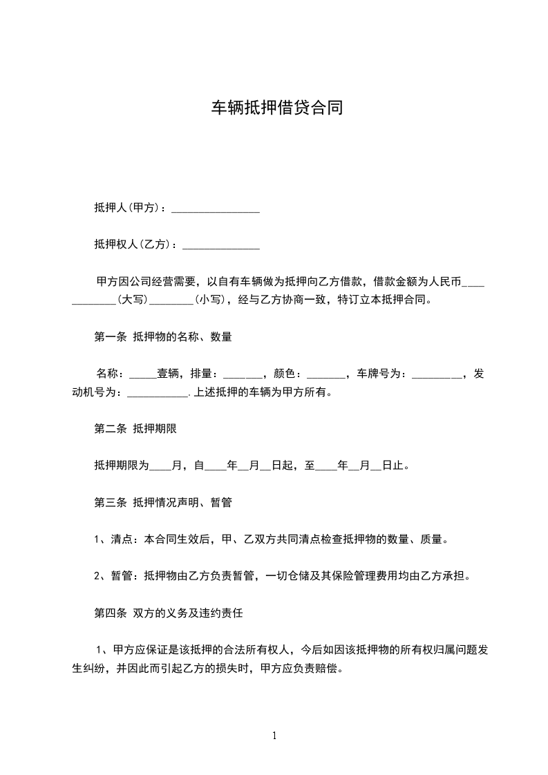 甲方因公司经营需要,以自有车辆做为抵押向乙方借款,借款金额为人民币(大写)(小写),经与乙方协商一致,特订立本抵押合同。