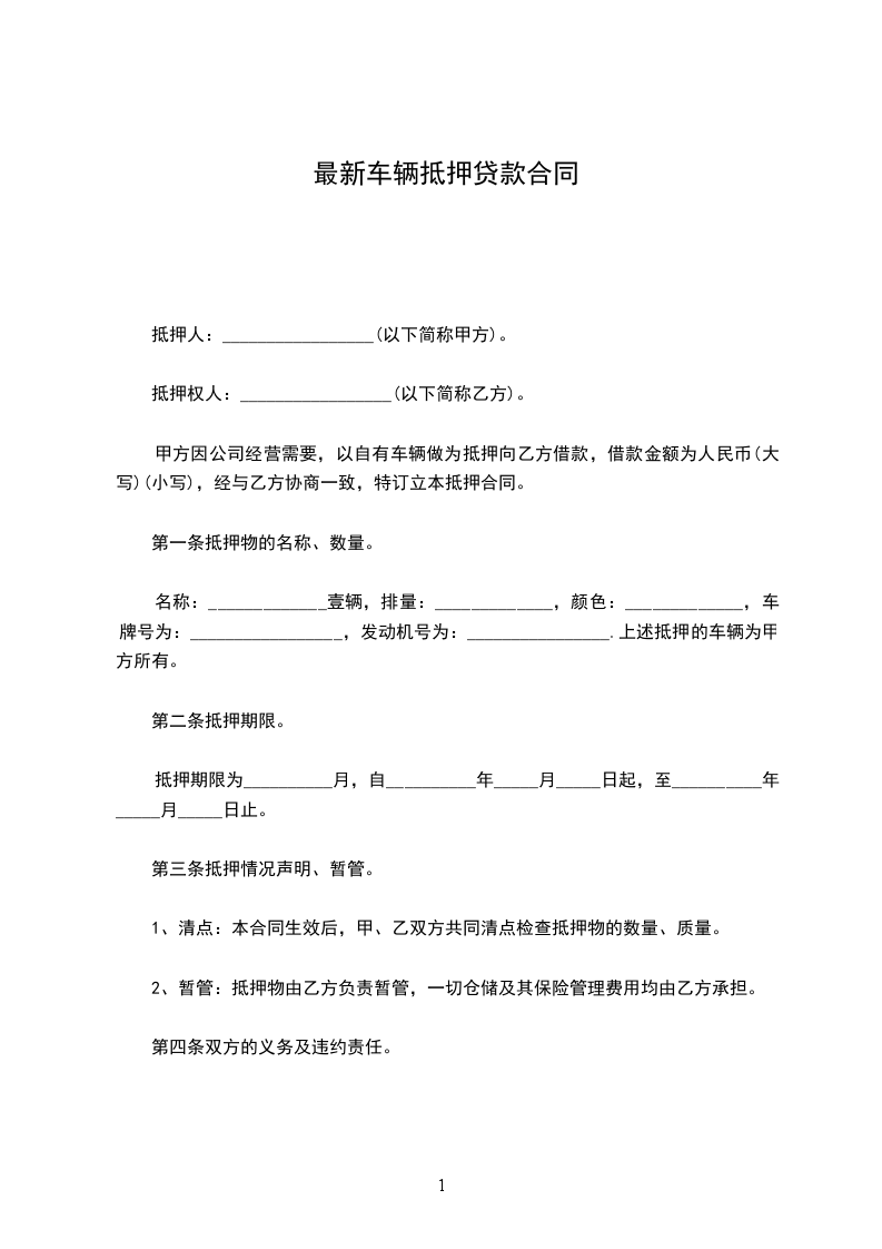 名称:_____________壹辆,排量:_____________,颜色:_____________,车牌号为:_________________,发动机号为:________________.上述抵押的车辆为甲方所有。