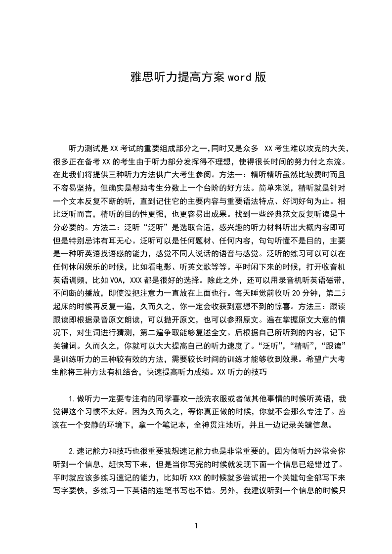 听力测试是XX考试的重要组成部分之一,同时又是众多XX考生难以攻克的大关,很多正在备考XX的考生由于听力部分发挥得不理想,使得很长时间的努力付之东流。在此我们将提供三种听力方法供广大考生参阅。方法一:精听精听虽然比较费时而且不容易坚持,但确实是帮助考生分数上一个台阶的好方法。简单来说,精听就是针对一个文本反复不断的听,直到记住它的主要内容与重要语法特点、好词好句为止。相比泛听而言,精听的目的性更强,也更容易出成果。找到一些经典范文反复听读是十分必要的。方法二:泛听“泛听”是选取合适,感兴趣的听力材料听出大概内容即可,但是特别忌讳有耳无心。泛听可以是任何题材、任何内容,句句听懂不是目的,主要是一种听英语找语感的能力,感觉不同人说话的语音与感觉。泛听的练习可以可以在任何休闲娱乐的时候,比如看电影、听英文歌等等。平时闲下来的时候,打开收音机,英语调频,比如VOA,XXX都是很好的选择。除此之外,还可以用录音机听英语磁带,不间断的播放,即使没把注意力一直放在上面也行。每天睡觉前收听20分钟,第二天起床的时候再反复一遍,久而久之,你一定会收获到意想不到的惊喜。方法三:跟读跟读即根据录音原文朗读,可以抛开原文,也可以参照原文。遍在掌握原文大意的情况下,对生词进行猜测,第二遍争取能够复述全文。后根据自己所听到的内容,记下关键词。久而久之,你就可以大大提高自己的听力速度了。“泛听”,“精听”,“跟读”是训练听力的三种较有效的方法,需要较长时间的训练才能够收到效果。希望广大考生能将三种方法有机结合,快速提高听力成绩。XX听力的技巧