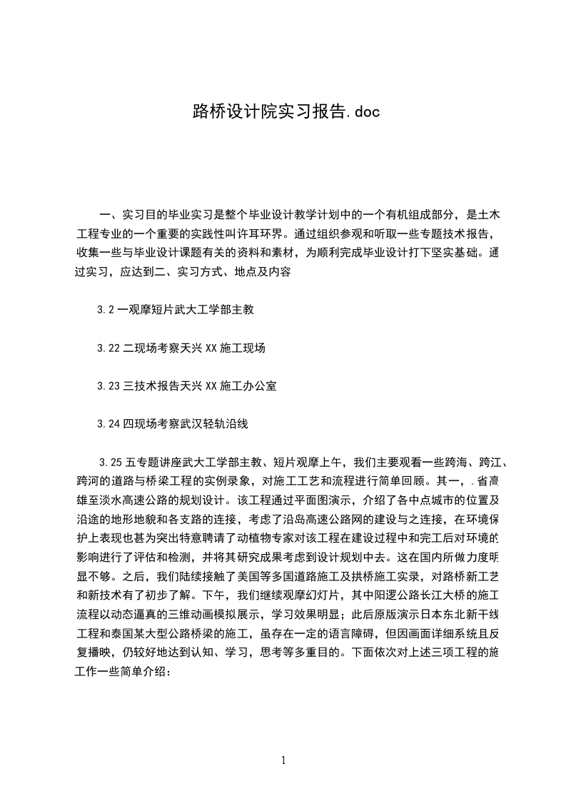 一、实习目的毕业实习是整个毕业设计教学计划中的一个有机组成部分,是土木工程专业的一个重要的实践性叫许耳环界。通过组织参观和听取一些专题技术报告,收集一些与毕业设计课题有关的资料和素材,为顺利完成毕业设计打下坚实基础。通过实习,应达到二、实习方式、地点及内容