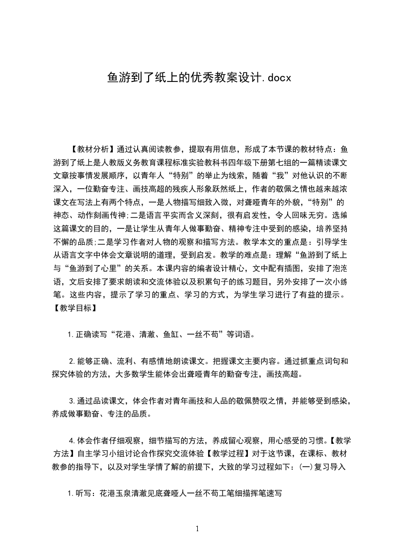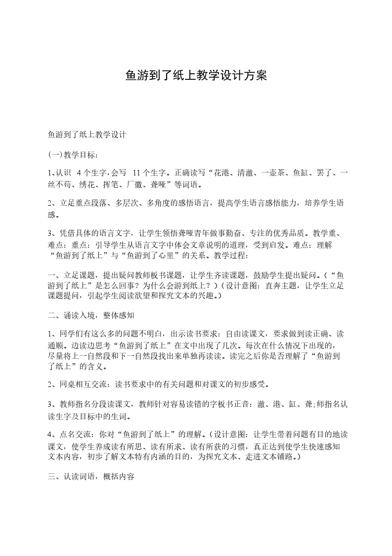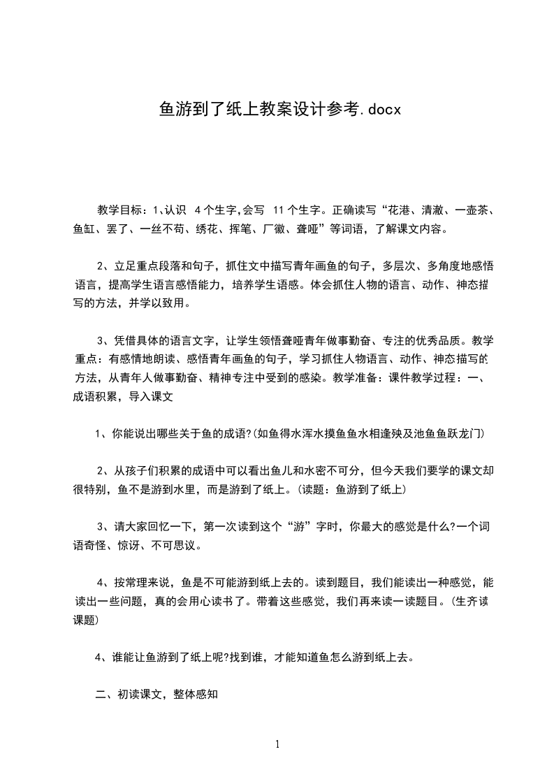 4、按常理来说,鱼是不可能游到纸上去的。读到题目,我们能读出一种感觉,能读出一些问题,真的会用心读书了。带着这些感觉,我们再来读一读题目。(生齐读课题)