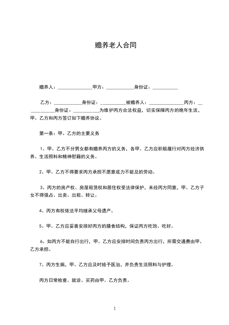 甲方_______________,男、__________年______月_______日生人,现年________岁。_______________,女、__________年________月________日生人,现年_______岁。由于两位老人年迈,生活不能自理,经两位老人同意,乙方和丙方达成赡养老人和甲方身后财产处理协议如下