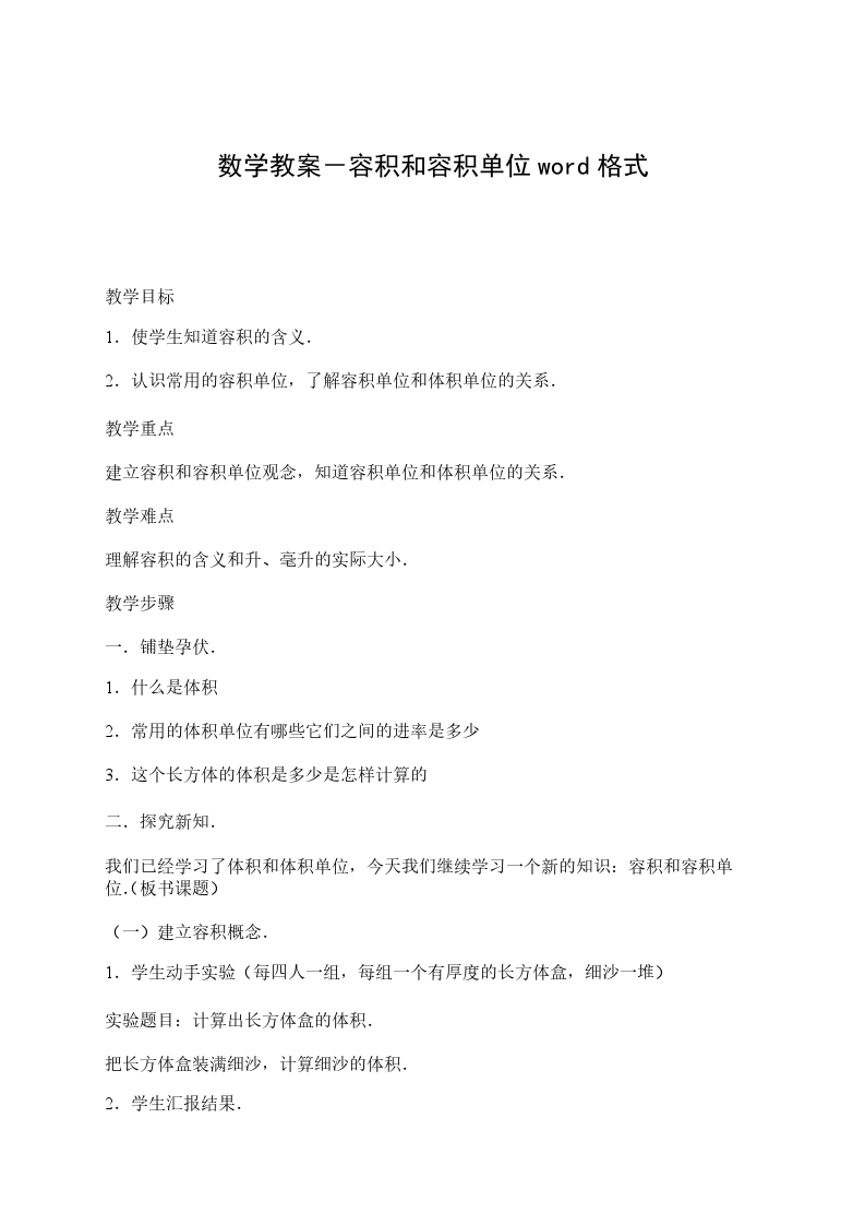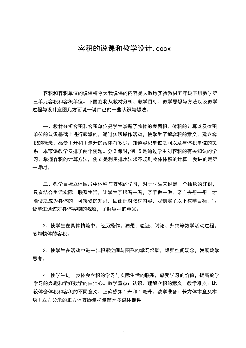 2024学年第二学期小学五年级数学教学设计依庄校部东路庄小学张博课题容积和容积单位第一课时知识与技能目标掌握知识使学生理解容积的意义,掌握容积的计算方法。使学生认识常用的容积单位升和毫升,掌握单位间的进率,明确容积和体积的联系与区别。方法与过程目标学会方法情感态度与价值观目标达到愚人经历容积概念的探究与理解过程。通过比较明确容积单位与体积单位的区别和联系培养学生的观察能力和探究意识