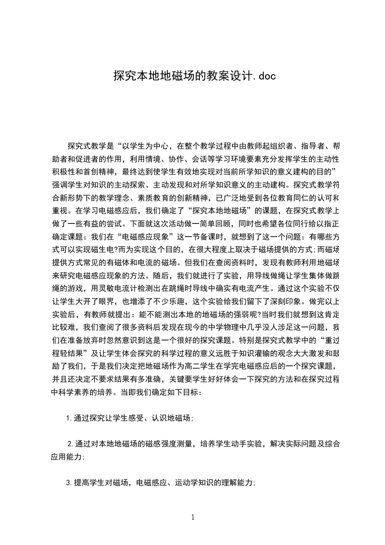 探究式教学是“以学生为中心,在整个教学过程中由教师起组织者、指导者、帮助者和促进者的作用,利用情境、协作、会话等学习环境要素充分发挥学生的主动性、积极性和首创精神,最终达到使学生有效地实现对当前所学知识的意义建构的目的”;强调学生对知识的主动探索、主动发现和对所学知识意义的主动建构。探究式教学符合新形势下的教学理念、素质教育的创新精神,已广泛地受到各位教育同仁的认可和重视。在学习电磁感应后,我们确定了“探究本地地磁场”的课题,在探究式教学上做了一些有益的尝试。下面就这次活动做一简单回顾,同时也希望各位同行给以指正。确定课题:我们在“电磁感应现象”这一节备课时,就想到了这一个问题:有哪些方式可以实现磁生电?而为实现这个目的,在很大程度上取决于磁场提供的方式;而磁场提供方式常见的有磁体和电流的磁场。但我们在查阅资料时,发现有教师利用地磁场来研究电磁感应现象的方法。随后,我们就进行了实验,用导线做绳让学生集体做跳绳的游戏,用灵敏电流计检测出在跳绳时导线中确实有电流产生。通过这个实验不仅让学生大开了眼界,也增添了不少乐趣,这个实验给我们留下了深刻印象。做完以上实验后,有教师就提出:能不能测出本地的地磁场的强弱呢?当时我们就想到这肯定比较难,我们查阅了很多资料后发现在现今的中学物理中几乎没人涉足这一问题,我们在准备放弃时忽然意识到这是一个很好的探究课题。特别是探究式教学中的“重过程轻结果”及让学生体会探究的科学过程的意义远胜于知识灌输的观念大大激发和鼓励了我们,于是我们决定把地磁场作为高二学生在学完电磁感应后的一个探究课题,并且还决定不要求结果有多准确,关键要学生好好体会一下探究的方法和在探究过程中科学素养的培养。当即我们确定如下目标: