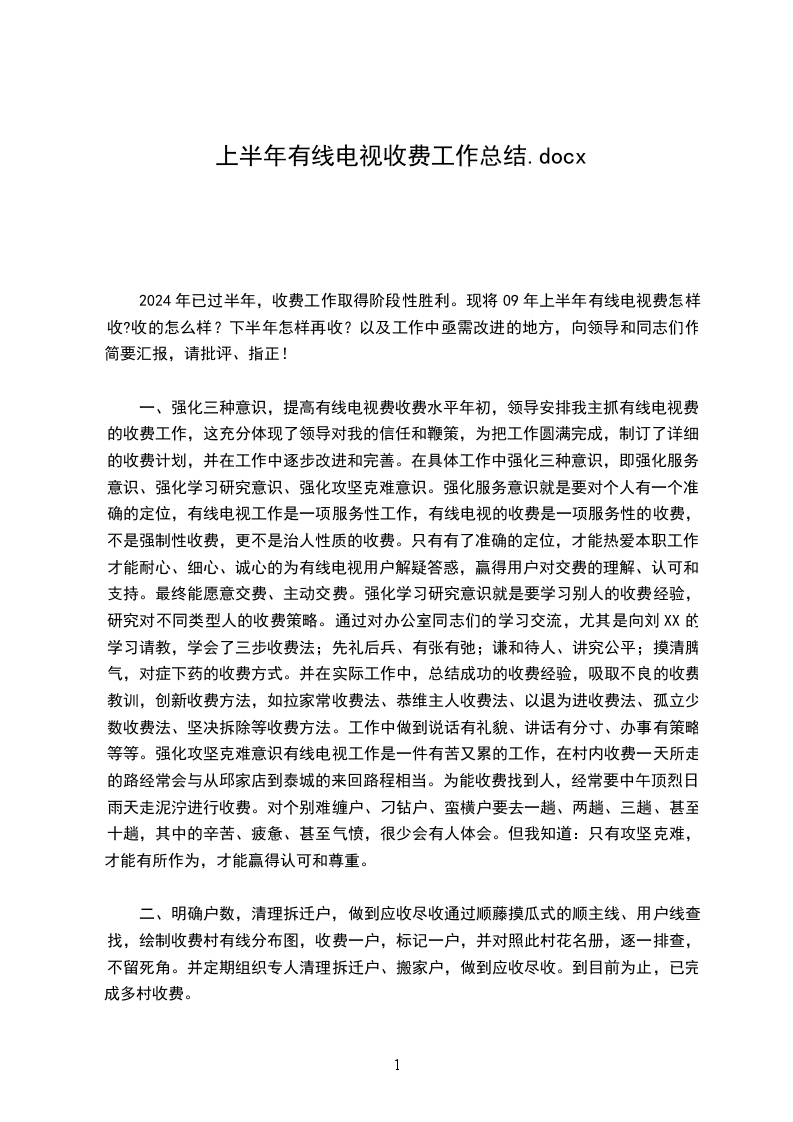 2024年已过半年,收费工作取得阶段性胜利。现将09年上半年有线电视费怎样收?收的怎么样?下半年怎样再收?以及工作中亟需改进的地方,向领导和同志们作简要汇报,请批评、指正!