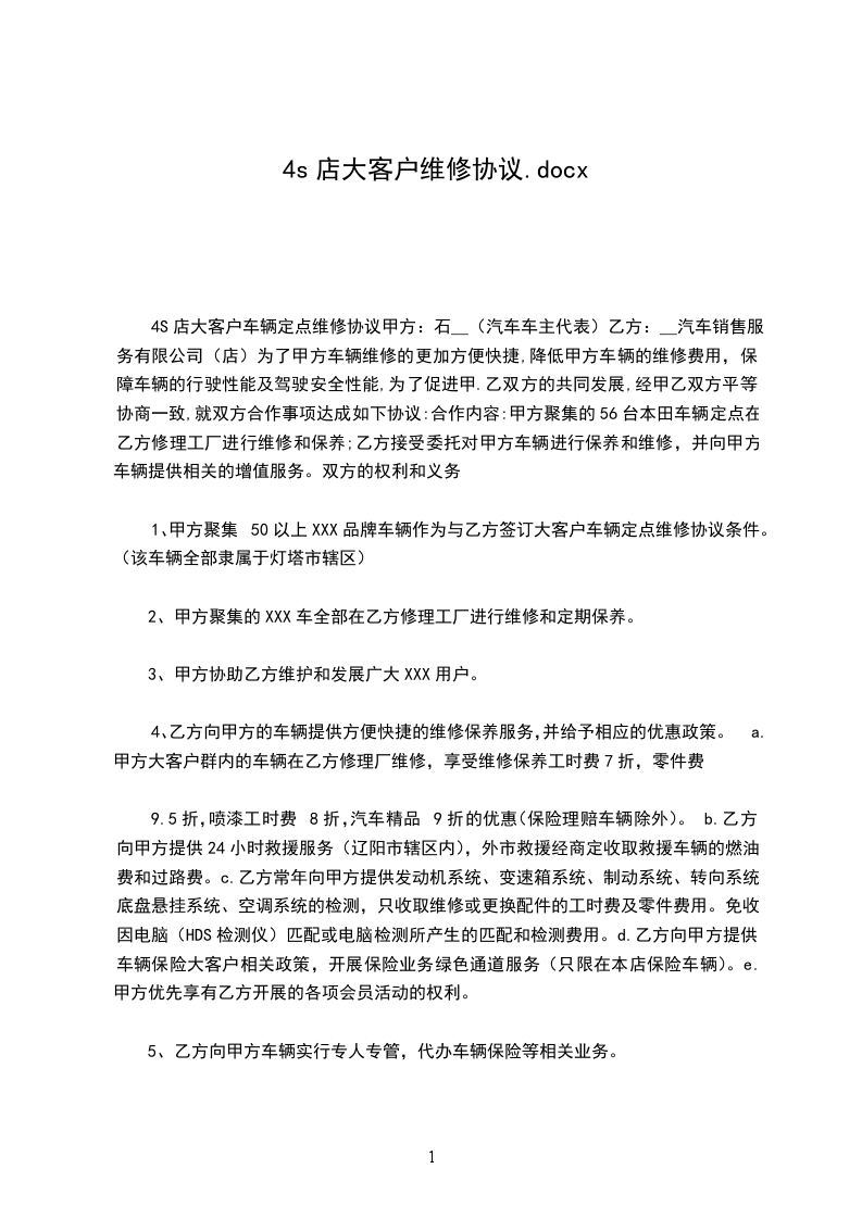 4S店大客户车辆定点维修协议甲方:石__(汽车车主代表)乙方:__汽车销售服务有限公司(店)为了甲方车辆维修的更加方便快捷,降低甲方车辆的维修费用,保障车辆的行驶性能及驾驶安全性能,为了促进甲.乙双方的共同发展,经甲乙双方平等协商一致,就双方合作事项达成如下协议:合作内容:甲方聚集的56台本田车辆定点在乙方修理工厂进行维修和保养;乙方接受委托对甲方车辆进行保养和维修,并向甲方车辆提供相关的增值服务。双方的权利和义务